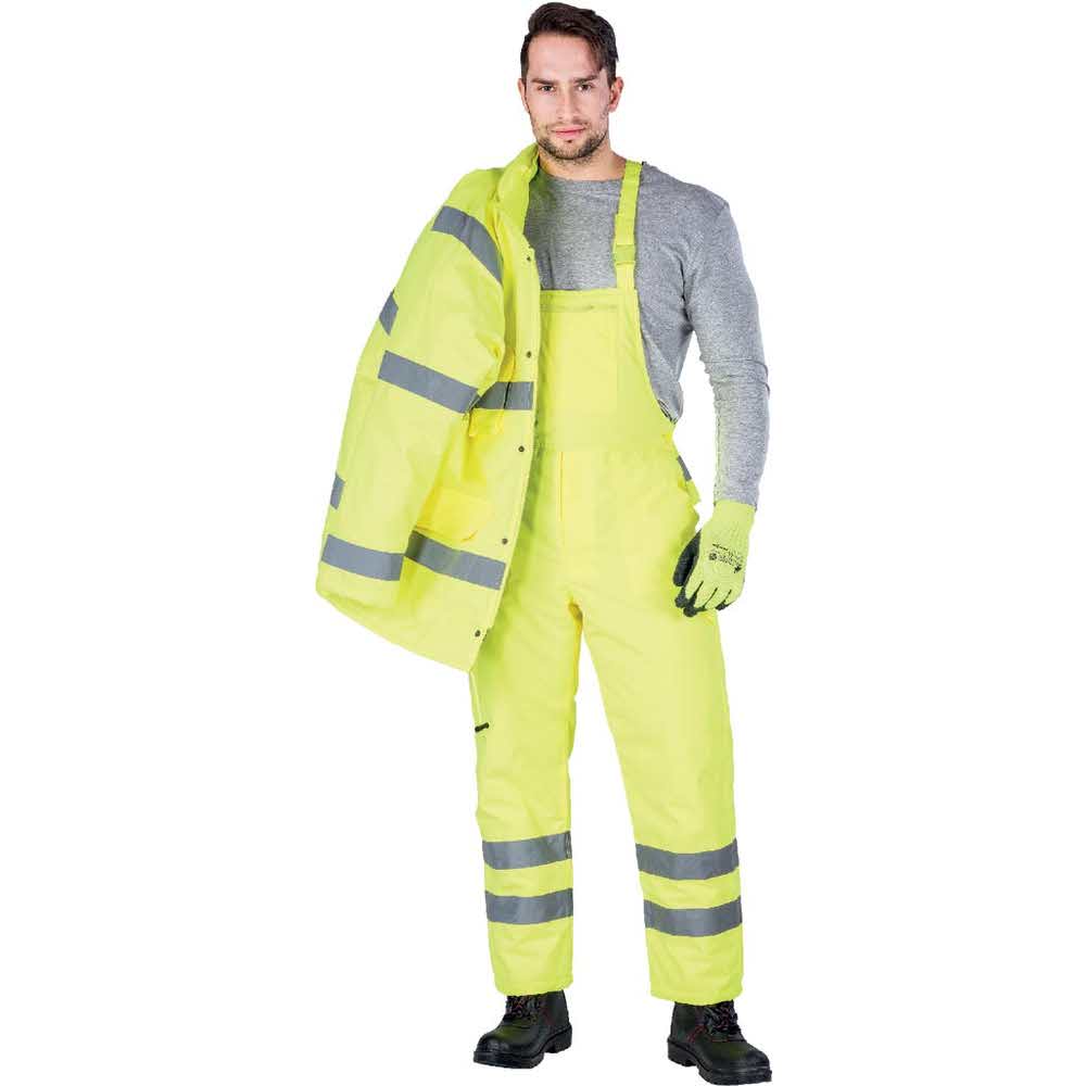 Spodnie ogrodniczki zimowe, z pasami odblaskowymi na dole nogawek. – powłoka 100% poliester oxford na PCV – wyściółka 100% poliester o gramaturze 130 g/m2 – podszewka 100% poliester typu tafta 190T – możliwość regulacji w długości szelkami – dwie boczne kieszenie – dodatkowa kieszeń w górnej partii spodni – idealne dla drogowców – materiał i pasy odblaskowe testowane zgodnie z normą EN471