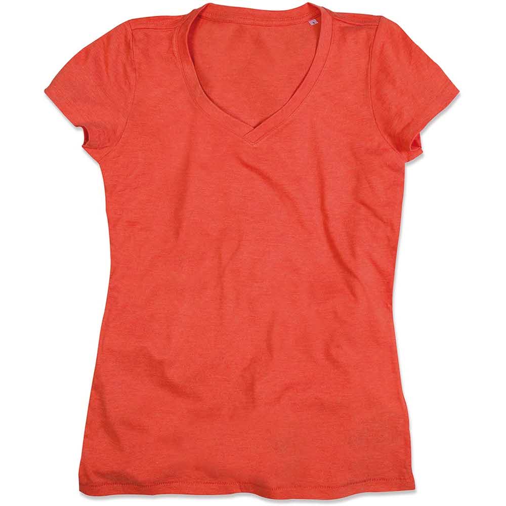 T-shirt damski V-neck ST9910. – 60% bawełny czesanej ring-spun, 40% poliestru – gramatura 145 g/m2 – szwy boczne – taśma wzmacniająca na karku i ramionach – wąski ściągacz z elastanem w dekolcie – trójkątny dekolt z zakładką – dekoracyjny ścieg na krawędzi rękawa i na dolnej krawędzi – wzmocniony szew na ramieniu