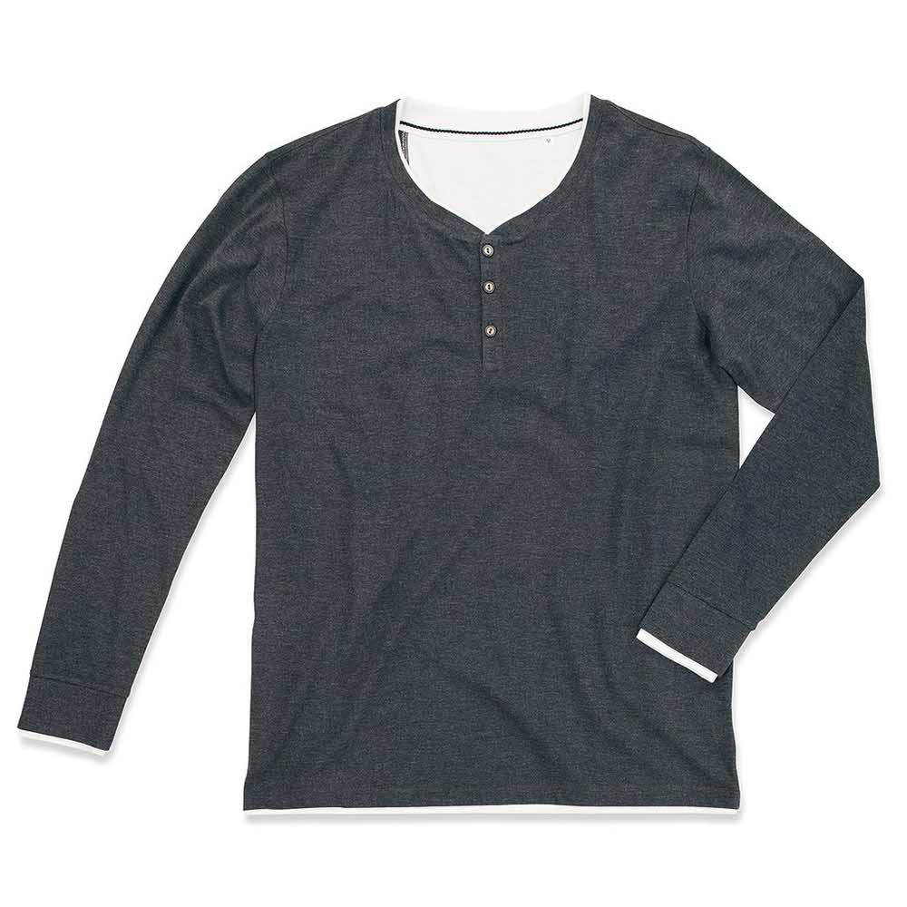 T-shirt męski z długim rękawem, okrągłym dekoltem i guzikami. – 60% bawełna czesana ring-spun, 40% poliester – gramatura 160 g/m2 – taśma wzmacniająca na karku – okrągły dekolt z wąskim ściągaczem i trzema metalowymi guzikami – modna wąska listwa z guzikami – podwójna warstwa białego materiału na kołnierzu, rękawach i dolnym brzegu – dekoracyjne szwy – szwy boczne – single jersey