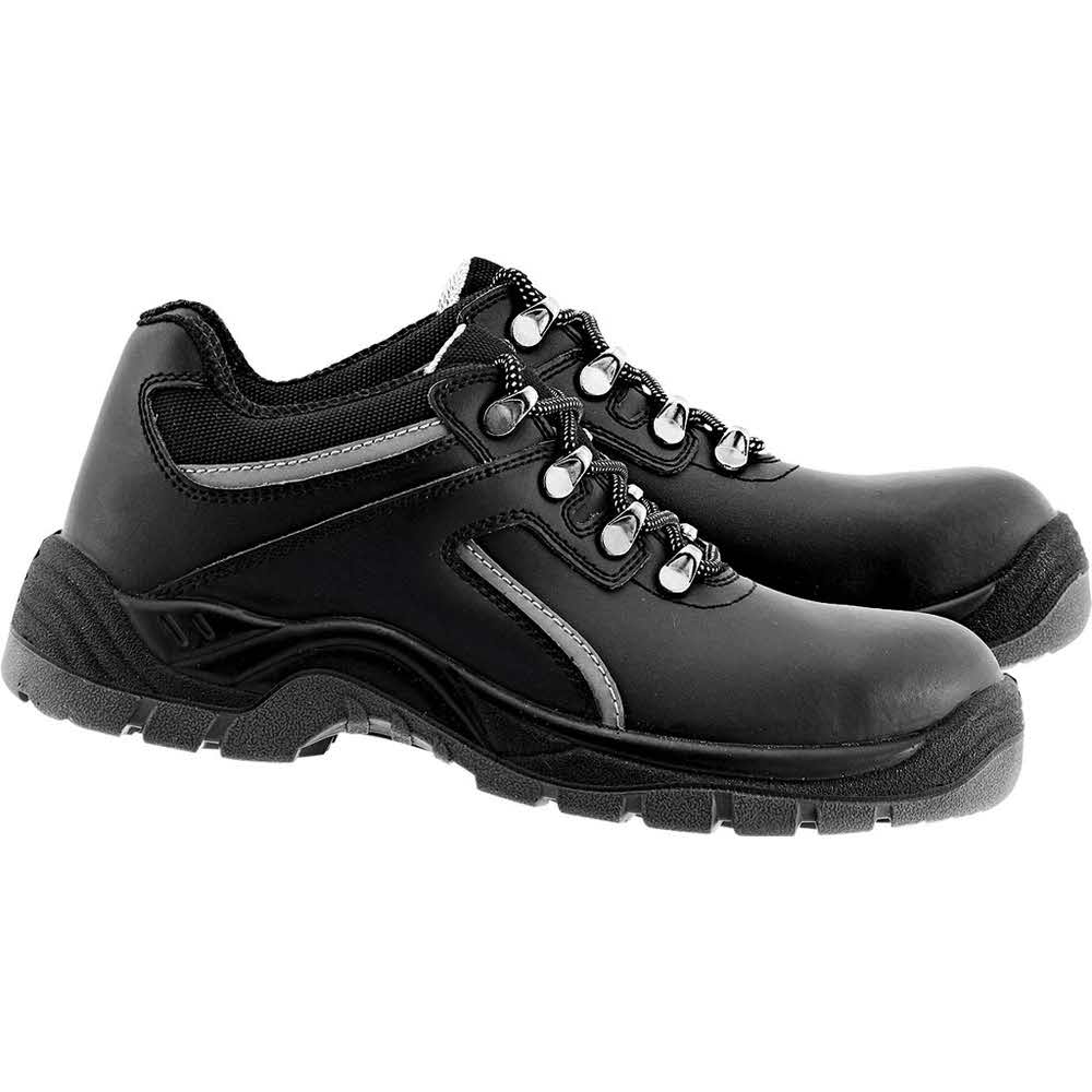 Buty bezpieczne DEREIS. – skóra bydlęca licowa w kolorze czarnym z szarymi odblaskowymi wstawkami po obu stronach butów – buty typu półbut, sięgające przed kostkę – podeszwa wykonana z podwójnego poliuretanu, – stalowy podnosek wytrzymały na uderzenia z energią 200 J oraz zgniecenia do 15 kN – kategoria SB SRA – spełniają wymagania norm EN20345, EN20344
