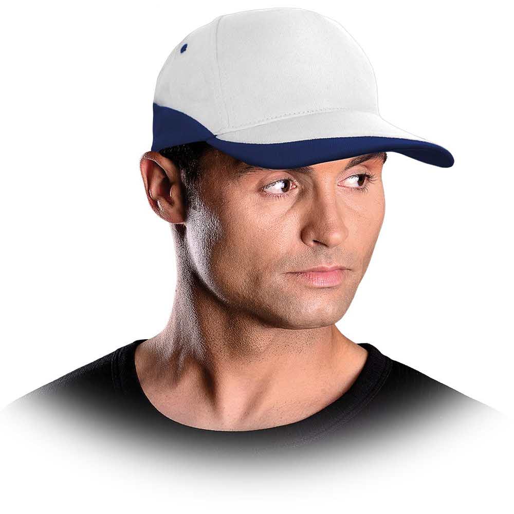 Czapka z daszkiem z regulacją na rzep. – 100% bawełna – gramatura 260 g/m2 – usztywniany daszek i przód czapki – zapinana na rzep – 5-panelowa z szerokim panelem czołowym doskonałym do zdobienia – dostępna w białym kolorze z kolorowymi wstawkami co pozwala na dopasowanie czapki do różnych kolorów odzieży