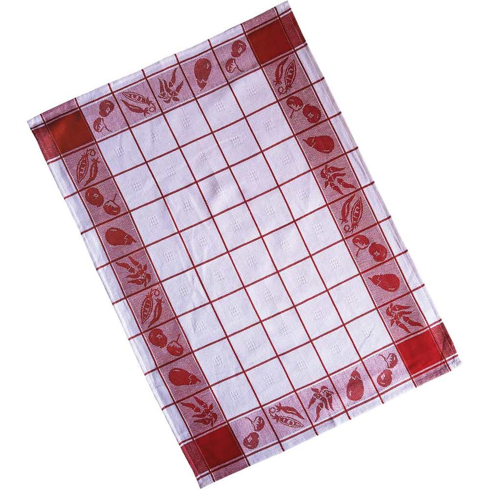 Żakardowa ściereczka kuchenna. – 100% bawełny – gramatura 80 g/m2 – rozmiar 50×70 cm – wzór w biało-czerwoną kratę z owocami – wysoka jakość bawełny doskonale wchłania wodę – w kartonie 24 opakowania po 3 szt = 72 szt. – najmniejsza jednostka sprzedaży 3 szt.