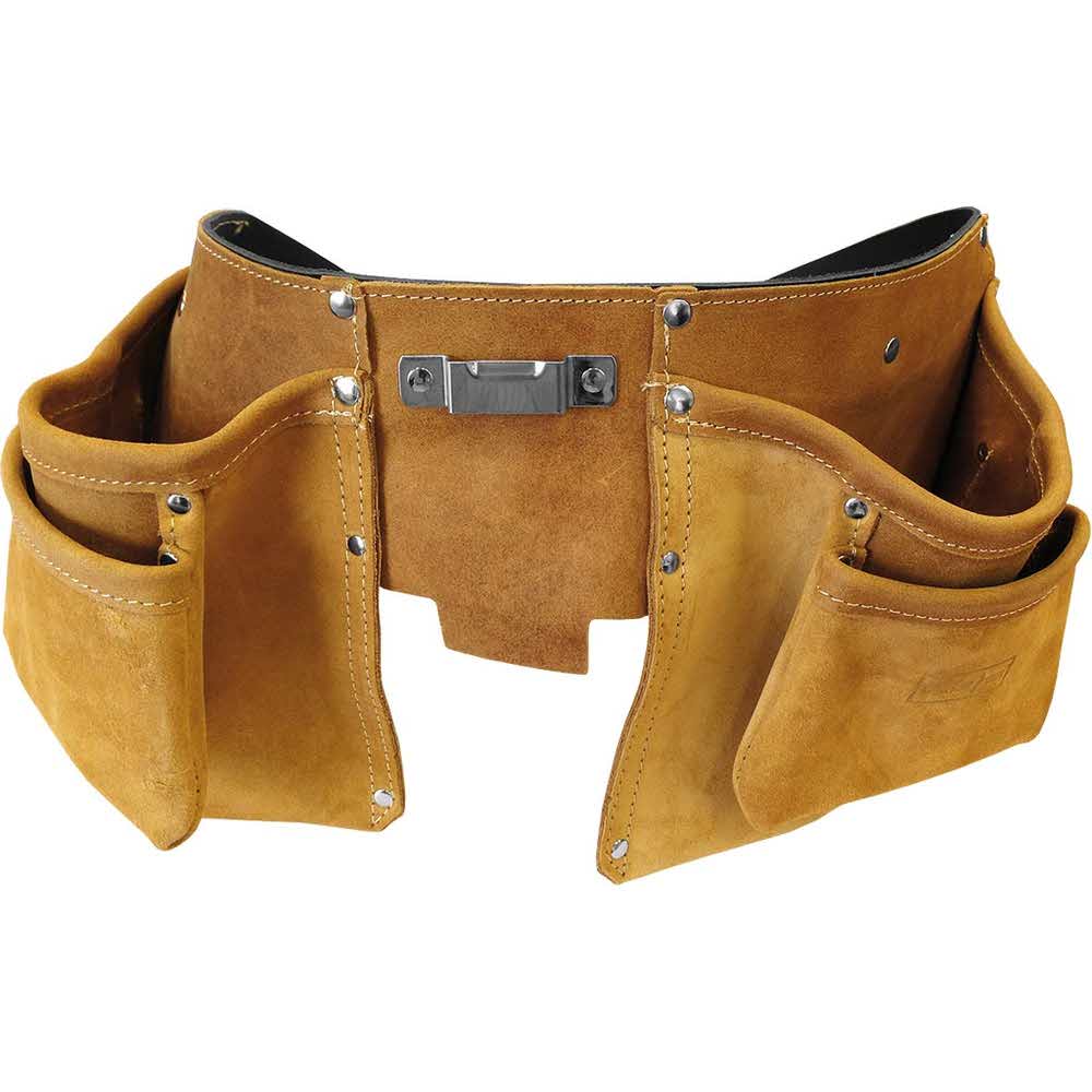 Pas monterski skórzany. – wykonany z dwoiny bydlęcej o grubości 1,5 – 1,7 mm – dziesięć kieszeni na narzędzia: dwie duże, dwie średnie oraz sześć małych – po środku pasa znajduje się uchwyt na miarkę – z dwóch stron posiada uchwyty na młotek w wersji skórzanej i metalowej – kieszenie umieszczone na skórzanym pasie o wymiarach 120 x 5 cm, z zapięciem w postaci metalowej klamry – konstrukcja pasa wzmocniona nitami