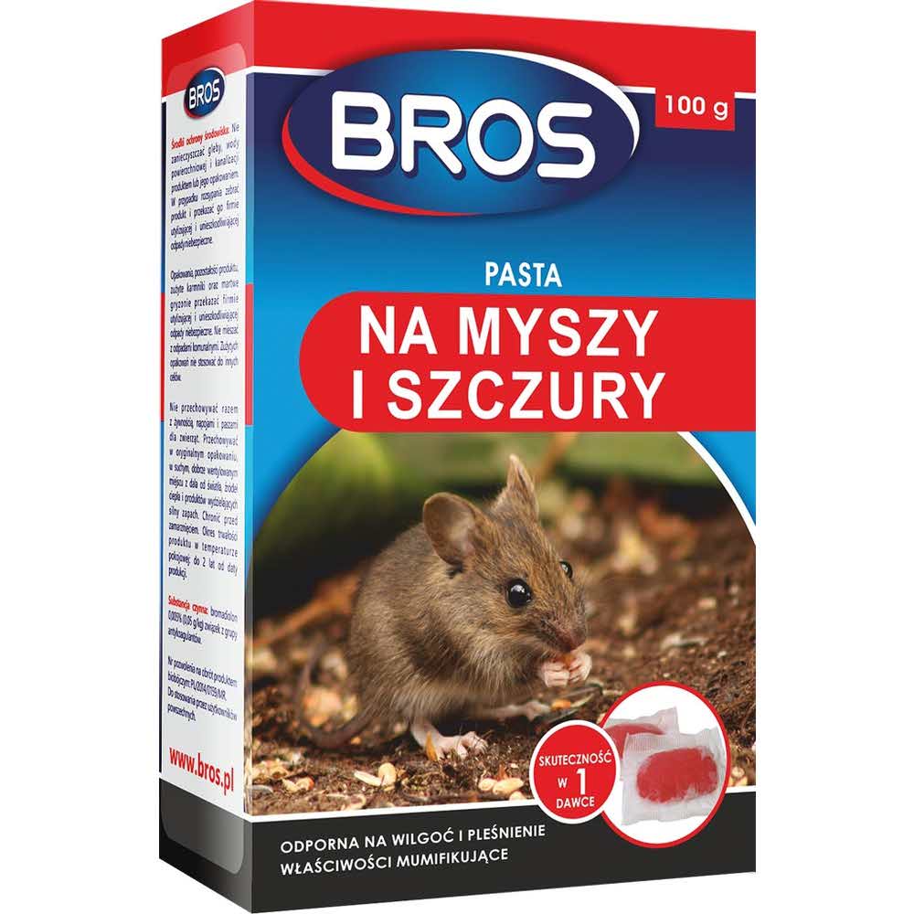 Pasta na myszy i szczury. – do stosowania w każdym miejscu i w każdych warunkach tj. chłodniach, budynkach inwentarskich itp. – odporna na wilgoć i pleśń – pasta jest miękka i wilgotna, przez co podobna do świeżego pokarmu – bardzo wygodna w zastosowaniu – można ją łatwo wyłożyć i zebrać jej resztki po deratyzacji