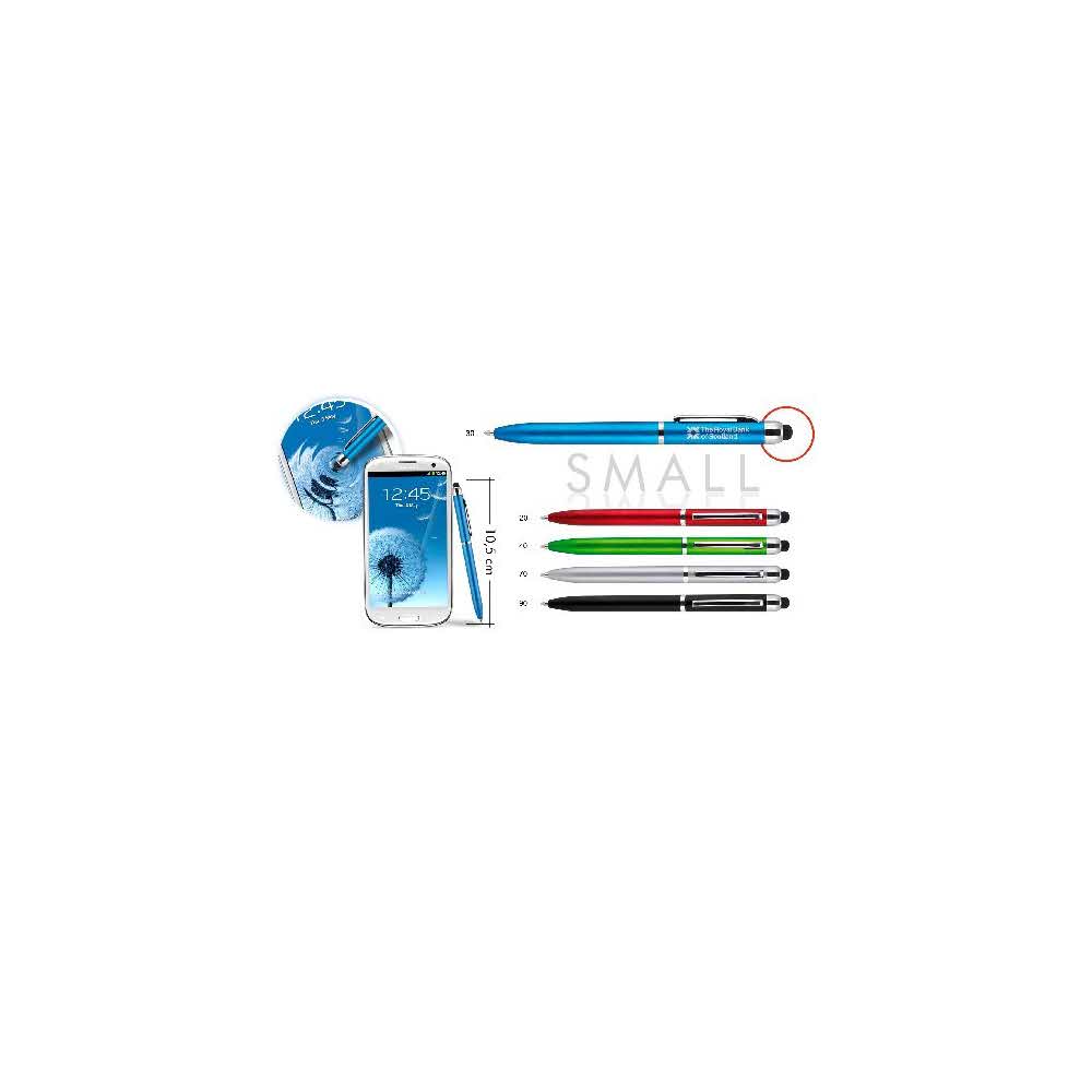 Elegancki, metalowy długopis ze srebrnymi wykończeniami. Wyposażony w gumkę do tabletów i smartfonów.