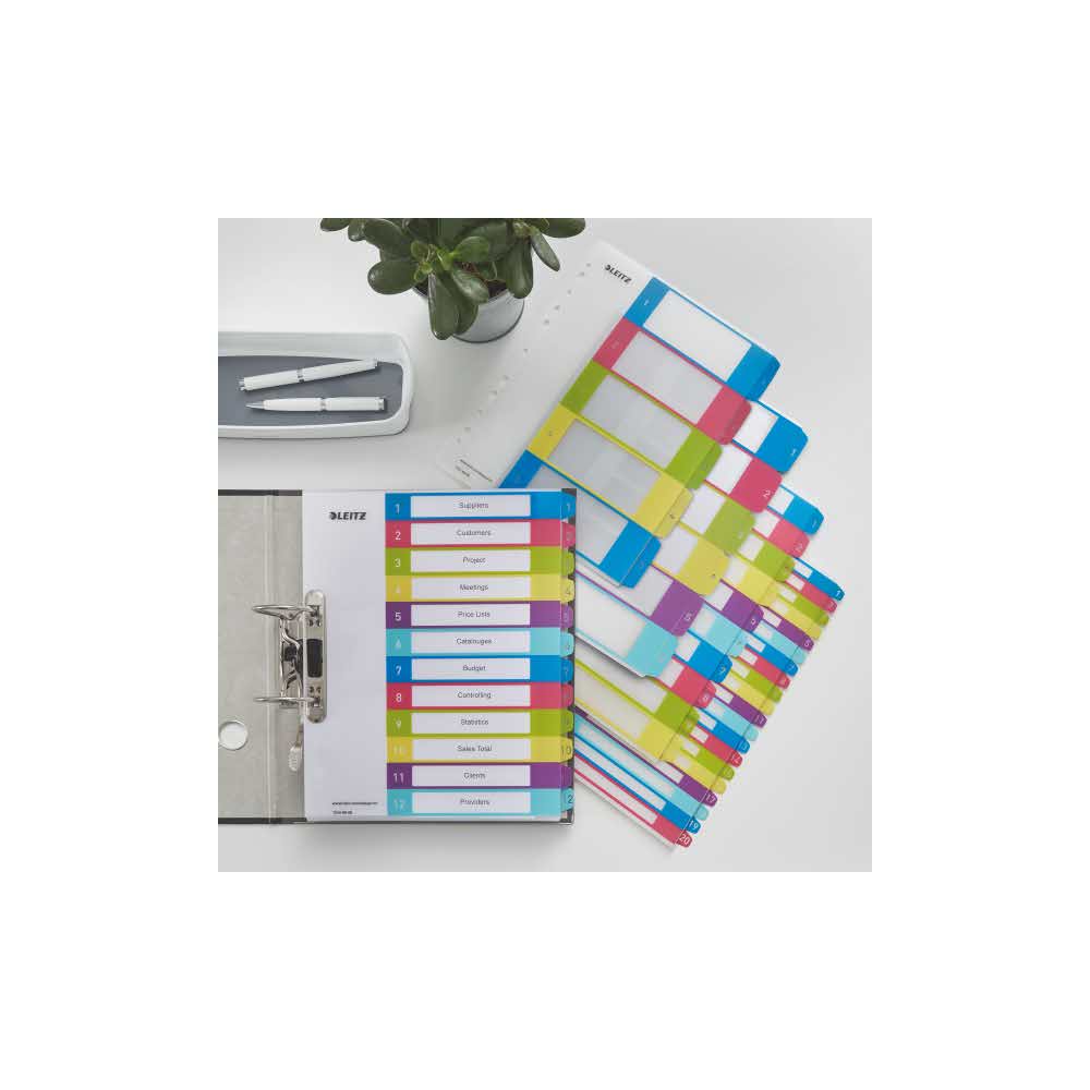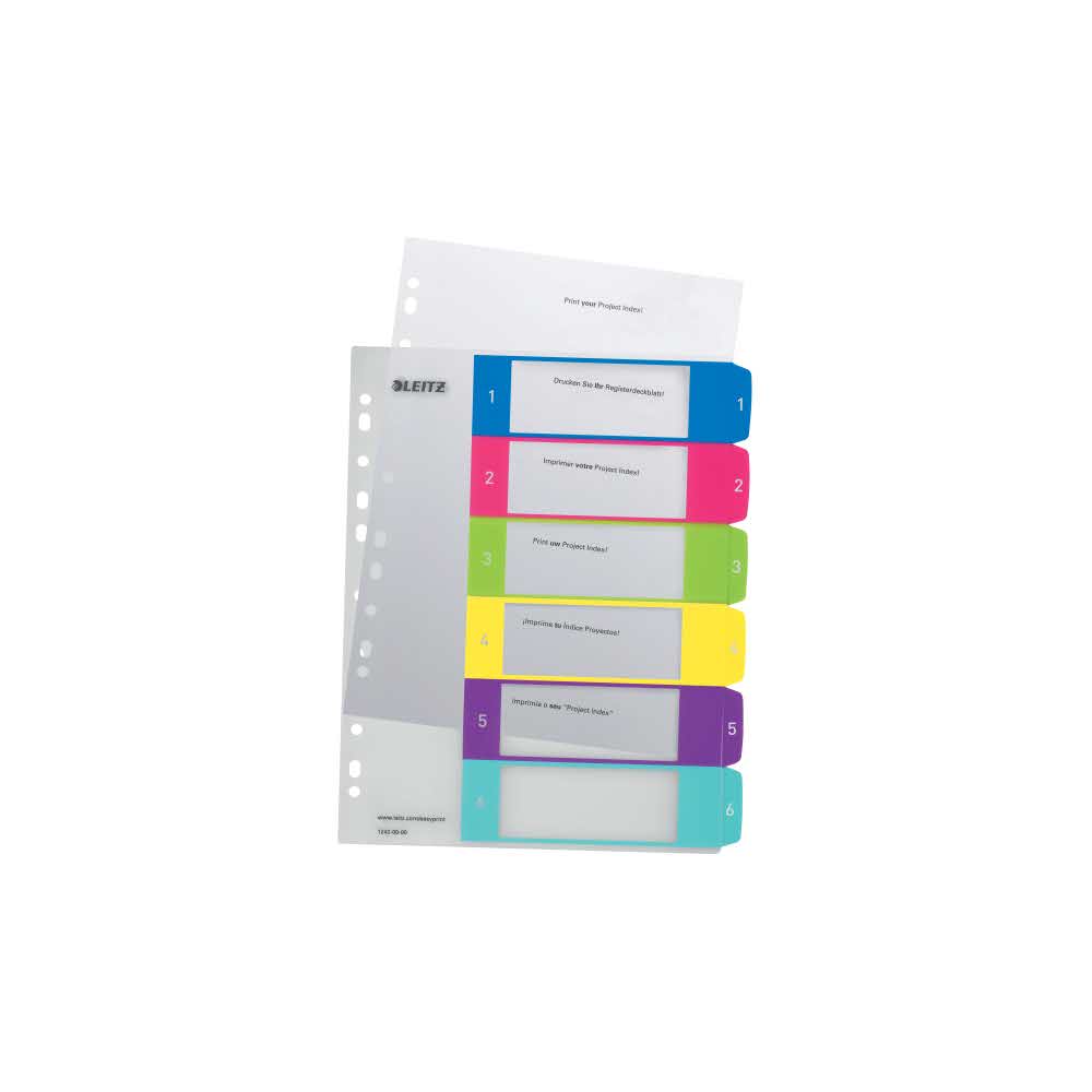 Bardzo mocne przekładki w intensywnych kolorach do wielokrotnego użytku. Ze spisem treści do indywidualnego zadruku na komputerze za pośrednictwem formularza umieszczonego na stronie: www.leitz.com/easyprint