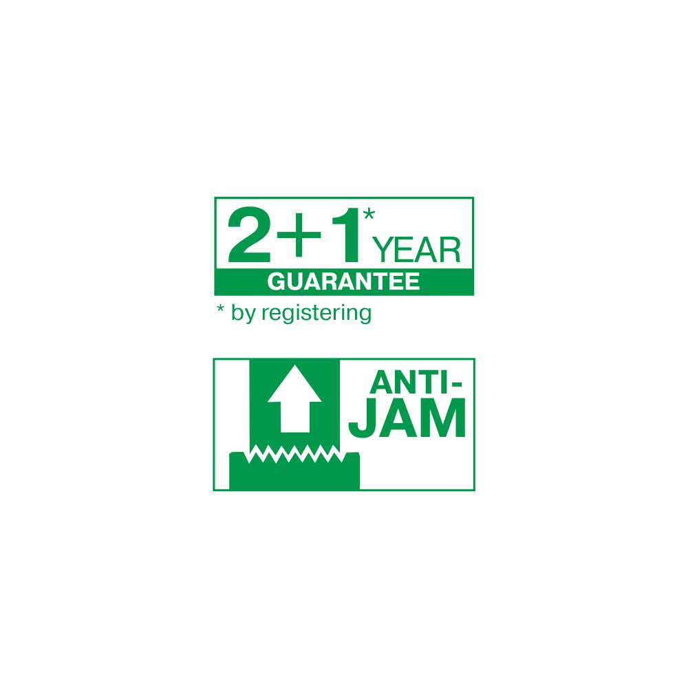 - Technologia zapobiegania zacięciom zapewnia bezproblemową pracę niszczarki – urządzenie zatrzymuje się automatycznie i cofa papier, jeżeli w podajniku umieszczonych zostało zbyt wiele arkuszy