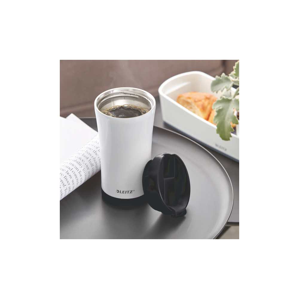 Kubek ze stali nierdzewnej z podwójną ścianką utrzymuje temperaturę ciepłych i zimnych napojów przez wiele godzin. Idealny wybór, aby cieszyć się ulubionym napojem podczas podróży. Kubek ze stali nierdzewnej w atrkacyjnych kolorach z kolekcji Leitz WOW, który utrzymuje temperaturę ciepłych i zimnych napojów przez wiele godzin. Element kolekcji Leitz WOW oferującej szeroki wybór stylowych produktów biurowych, zaprojektowanych w przykuwających wzrok stylowych kolorach, przeznaczonych dla osób pracujących w biurach lub często przemieszczających się Podwójne ścianki izolowane próżniowo wykonane ze stali nierdzewnej Kubek termiczny – utrzymuje temperaturę gorących lub zimnych napojów przez wiele godzin Całkowicie szczelny Pojemność 380 ml Pasuje do większości uchwytów montowanych w samochodach Bezpieczny dla żywności, nie zawiera BPA Gdy kubek wypełniony jest gorącym napojem, zewnętrzna ścianka pozostaje chłodna i nie skrapla się na niej para wodna Zaleca się ręczne mycie kubka, przykrywka może być myta w zmywarce Przyjazny dla środowiska dzięki możliwości wielokrotnego używania Element kolekcji Leitz WOW oferującej szeroki wybór stylowych produktów biurowych, zaprojektowanych w przykuwających wzrok stylowych kolorach, przeznaczonych dla osób pracujących w biurach lub często przemieszczających się Podwójne ścianki izolowane próżniowo wykonane ze stali nierdzewnej Kubek termiczny – utrzymuje temperaturę gorących lub zimnych napojów przez wiele godzin Całkowicie szczelny Pojemność 380 ml Pasuje do większości uchwytów montowanych w samochodach Bezpieczny dla żywności, nie zawiera BPA Gdy kubek wypełniony jest gorącym napojem, zewnętrzna ścianka pozostaje chłodna i nie skrapla się na niej para wodna