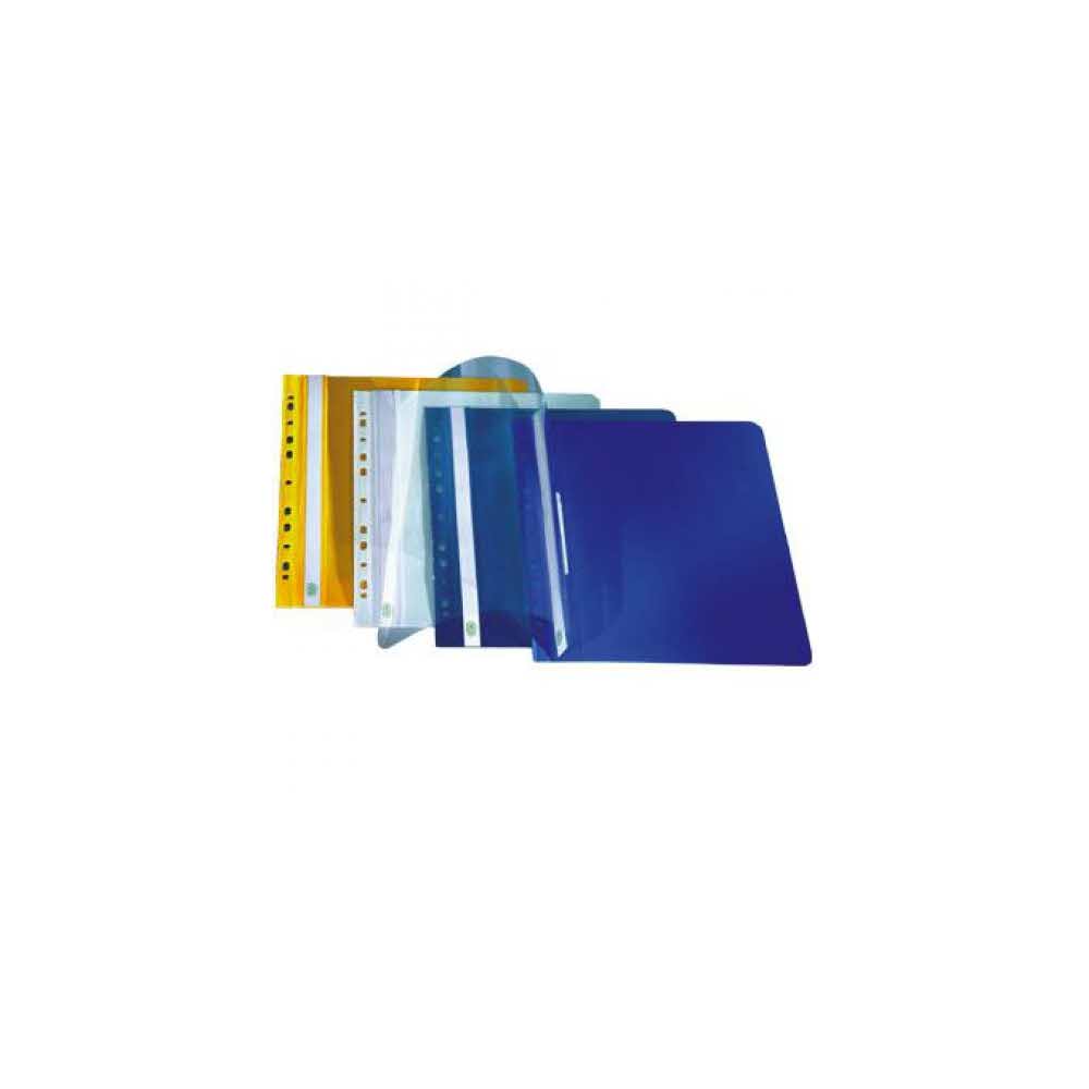 Trwały skoroszyt z PCV. Z przezroczystą bezbarwną okładką i otworami umożliwiającymi wpinanie do segregatora. Wymienna etykieta o dugości caego grzbietu. Kolory: czerwony, czarny, niebieski, zielony, żółty, biały.