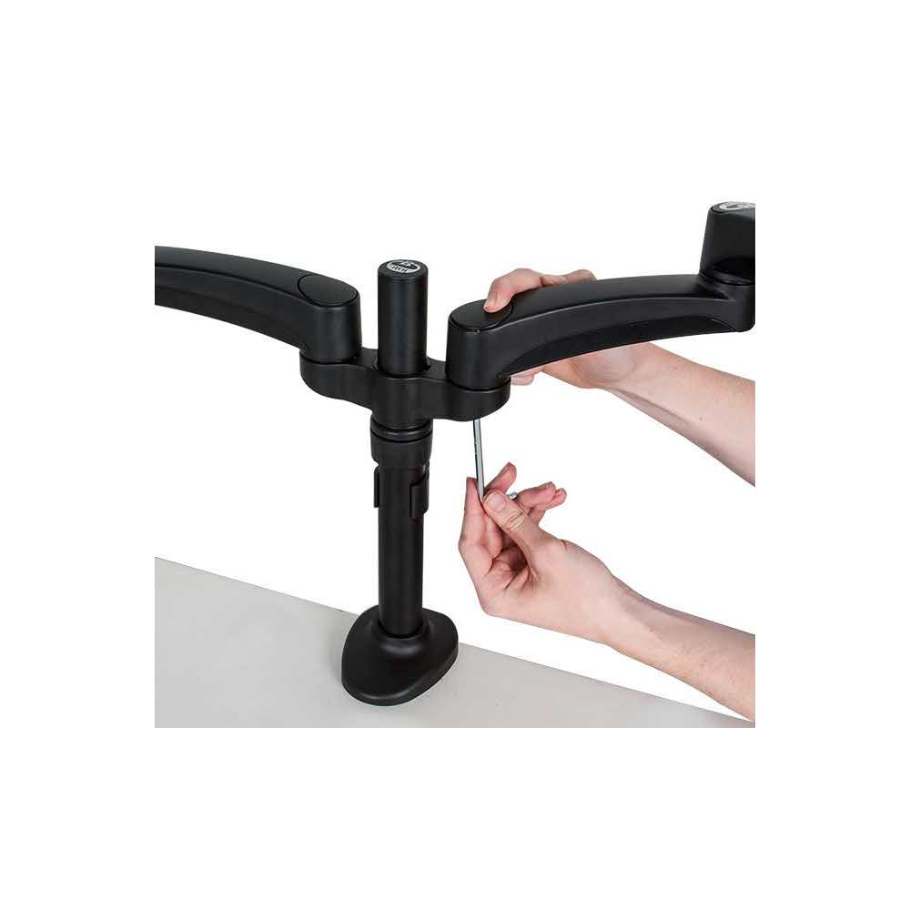 BT7374 to podwójny uchwyt na biurko z ramieniem przegubowym, wykonany z trwałego aluminium z anodowanym, polerowanym wykończeniem. Nadaje się do ekranów o przekątnej do 28 cali. Każde ramię ma trzy punkty obrotu oraz posiada możliwość obrótu ekranu o 360 , dzięki czemu ten uchwyt biurowy jest idealny do montażu pionowego lub poziomego. Uchwyt można łatwo przymocować do tyłu lub boku biurka lub w otworze przelotowym w blacie. WŁAŚCIWOŚCI: – Wysokiej jakości estetyka z trwałym, anodowanym, polerowanym wykończeniem – Łatwe boczne pozycjonowanie ekranu – Regulacja wysokości za pomocą beznarzędziowego kołnierza blokującego – W komplecie zacisk biurkowy, przelotka – Przegubowe ramiona można zablokować w żądanym położeniu za pomocą dołączonych stoperów – Zintegrowane zarządzanie kablami – Obrót ekranu o 360 ułatwia obrót ekranu z pozycji pionowej do pionowej – Prosta instalacja typu "hook-on" – W zestawie wszystkie elementy montażowe