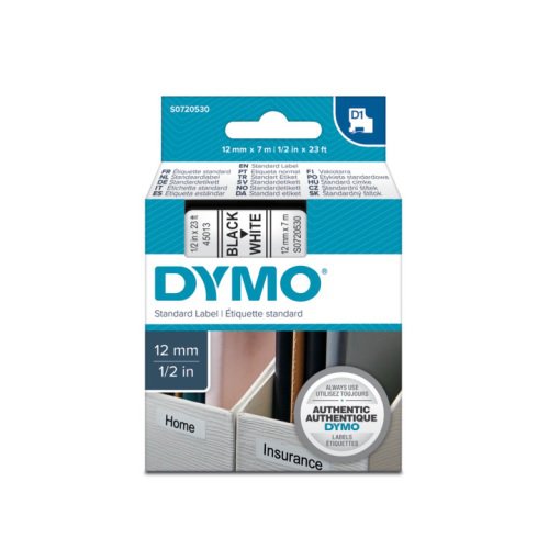 DYMO D1 45013 black on white to taśma samoprzylepna z klejem dobrze trzymającym do podłoża (plastik, metal, szkło, drewno), przeznaczona do drukarek Dymo. Po odklejeniu nie pozostawia śladów. Trwała, odporna na wilgoć, promieniowanie UV oraz działaniu tłuszczy, olejów i temperaturę.