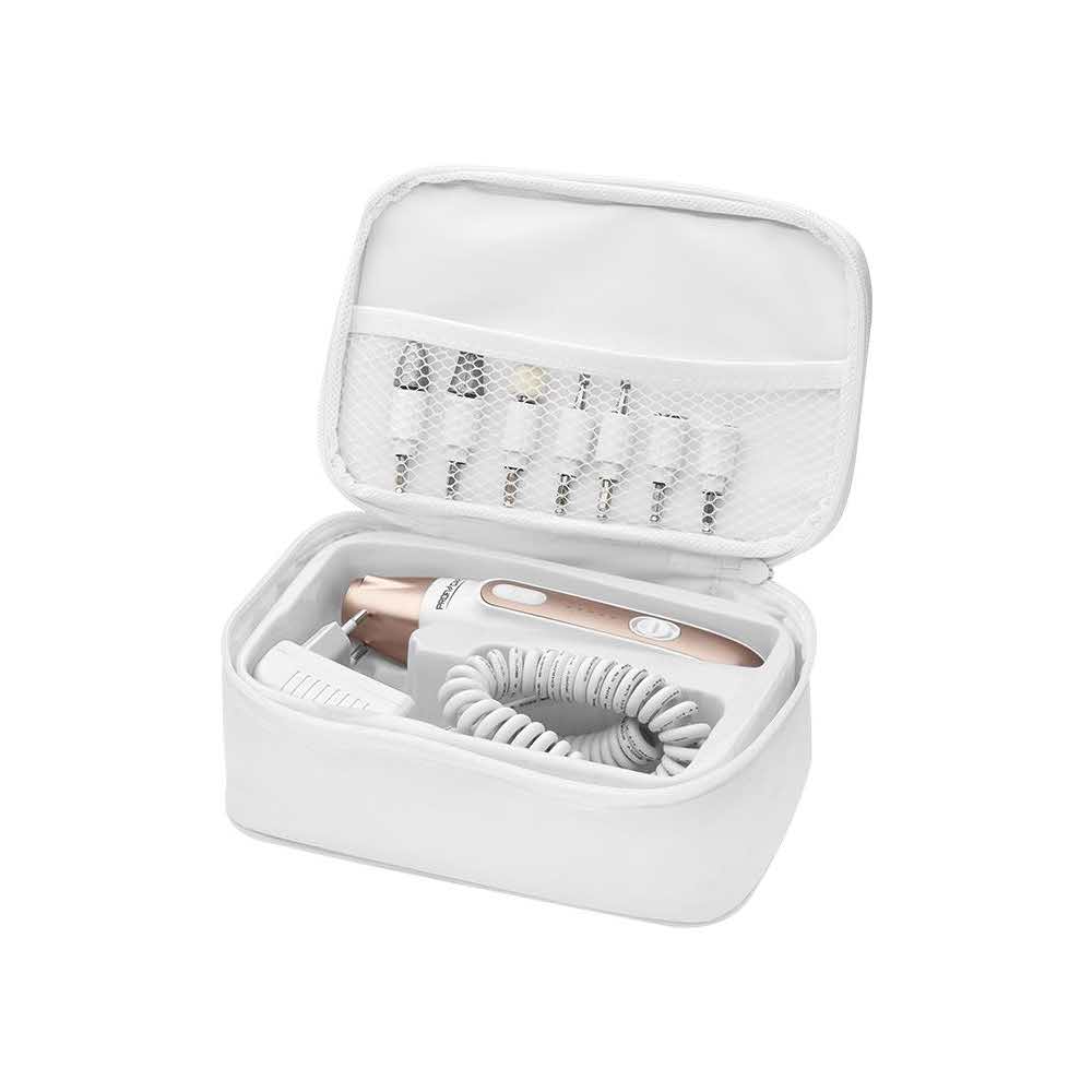 Zgrabny zestaw do kosmetycznej pielęgnacji dłoni i stóp w praktycznym podróżnym etui. Oprócz frezarki zawiera aż siedem wymiennych końcówek do ścierania i polerowania. Pięć poziomów elektronicznej kontroli prędkości oraz długi przewód zapewnią wygodę użytkowania