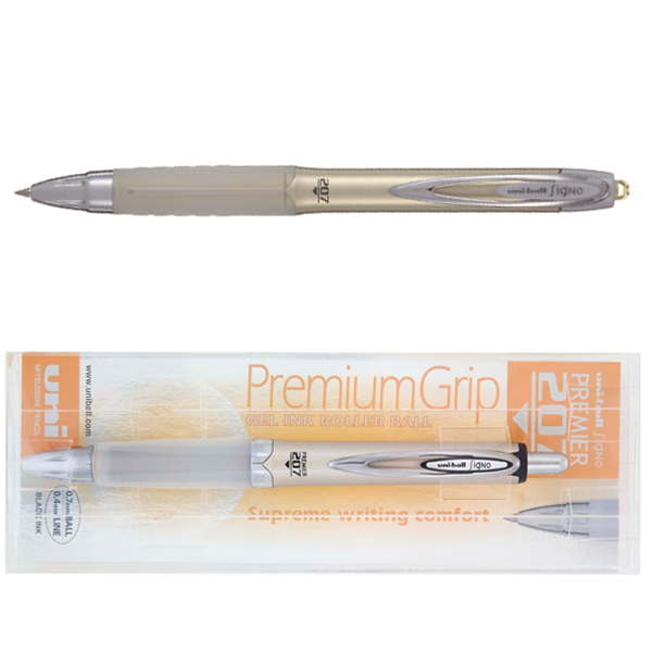 Długopis żelowy UNI UMN-207GG, najwyższy komfort pisania – ultra miękki, silikonowy uchwyt chroniący przed odciskami, zgrubieniami naskórka i bólem palców, tusz pigmentowy, wodoodporny i odporny na blaknięcie, metalowy klip oraz końcówka ze stali nierdzewnej, końcówka ze stali nierdzewnej, średnica kulki piszącej 0,7 mm, grubość linii pisania ok. 0,4 mm, dostępne kolory obudowy: złoty, niebieski, srebrny, kolor wkładu: czarny, wymienny wkład UMR-87