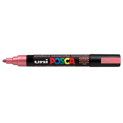 Uniwersalny marker UNI PC-5M z farbą plakatową do pisania i malowania po każdej powierzchni: papierze, tkaninie, plastiku, terakocie, szkle, porcelanie, metalu, drewnie, odporny na działanie światła i warunków atmosferycznych, tusz na bazie wody nie przesiąka przez papier, różne kolory tuszu po wyschnięciu nie łączą się ze sobą, okrągła końcówka – grubość linii pisania: 1,8 – 2,5 mm