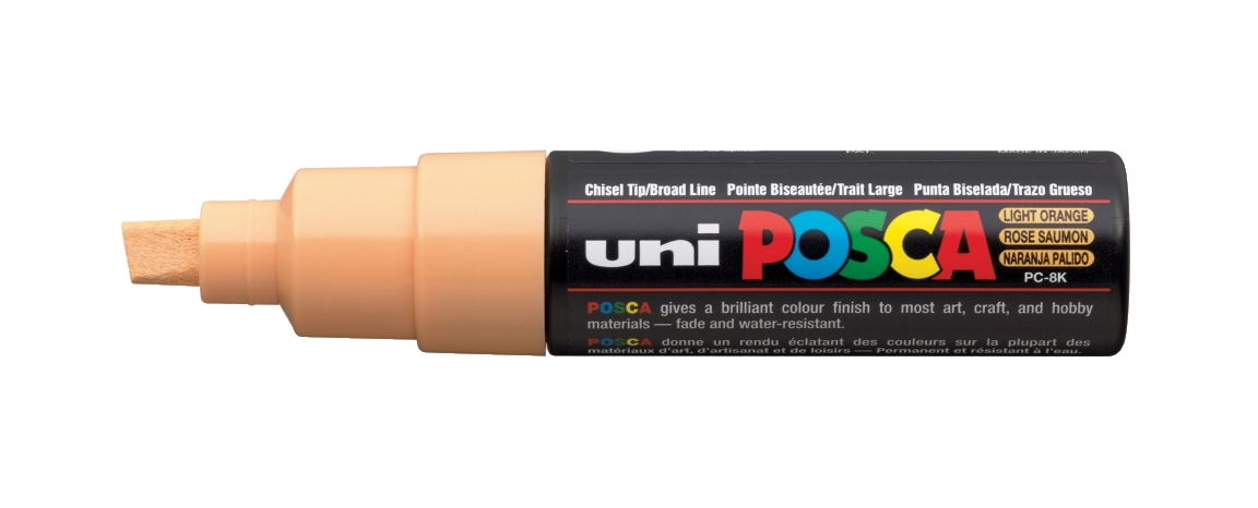 Uniwersalny marker UNI PC-8K z farbą plakatową do pisania i malowania po każdej powierzchni: papierze, tkaninie, plastiku, terakocie, szkle, porcelanie, metalu, drewnie, odporny na działanie światła i warunków atmosferycznych, tusz na bazie wody nie przesiąka przez papier, różne kolory tuszu po wyschnięciu nie łączą się ze sobą, ścięta końcówka – grubość linii pisania: 8 mm