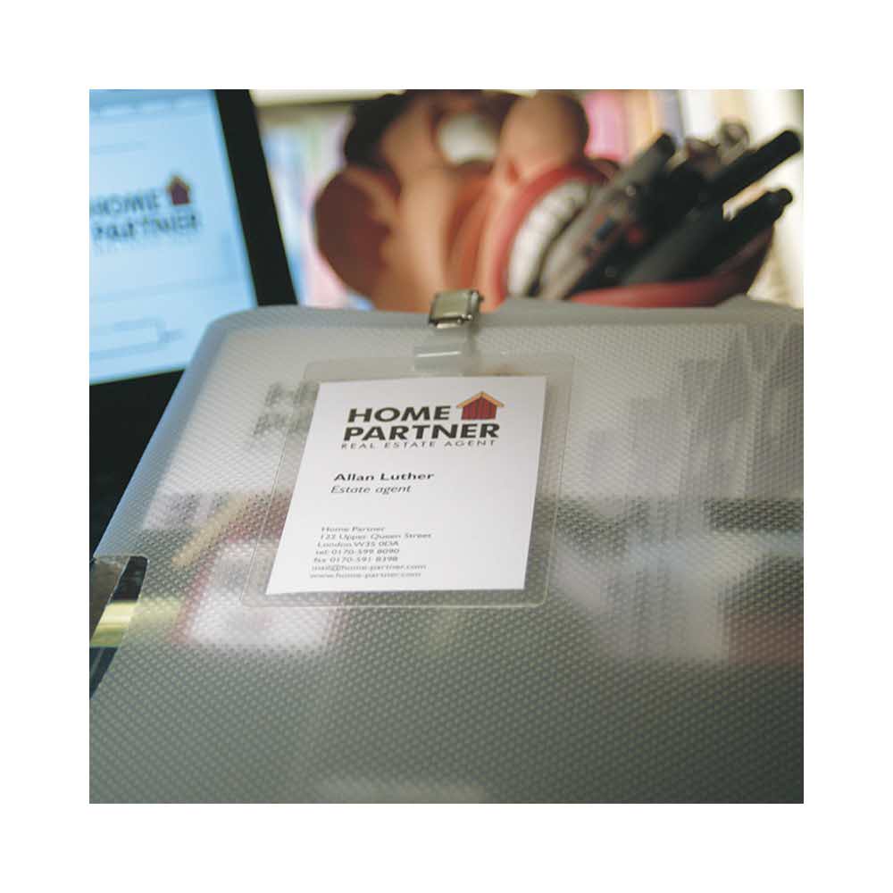 Samolaminujące karty identyfikacyjne utrwalają wsunięte karty identyfikacyjne uniemożliwiając ich wyjęcie. Identyfikator idealny na konferencje, seminaria i targi branżowe, format poziomy z klipsem, tańsza alternatywa w stosunku do identyfikatorów laminowanych mechanicznie, wymiary to 104x74mm, jednostka sprzedaży to 1 opakowanie zawierające 25 sztuk.