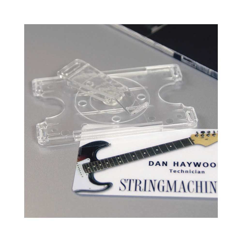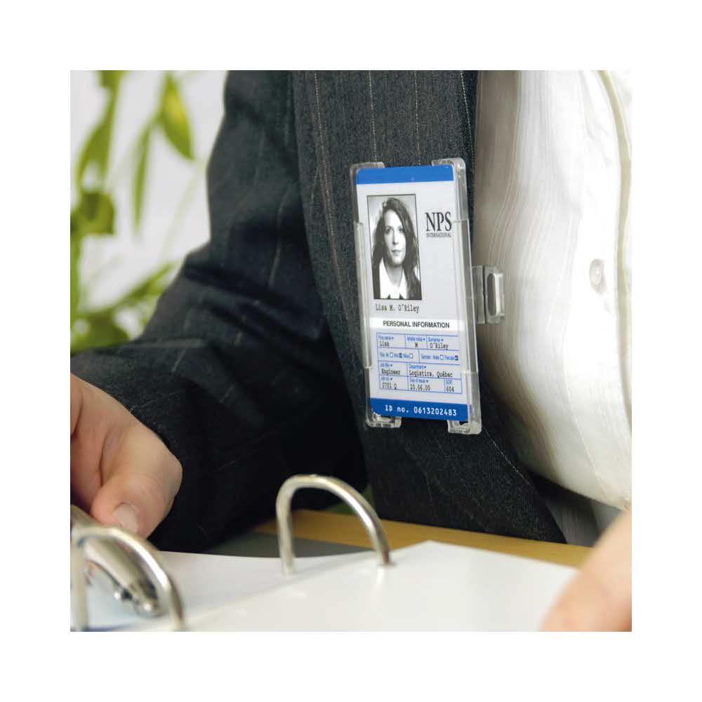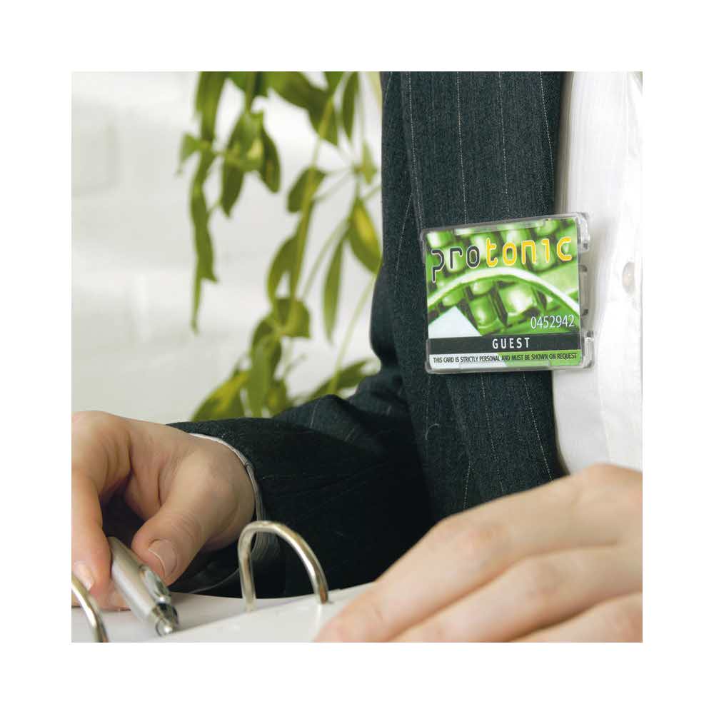 Oprawka na identyfikatory idealne na konferencje, seminaria i targi branżowe, format poziomy z obrotowym klipsem, tańsza alternatywa w stosunku do identyfikatorów laminowanych mechanicznie, wymiary 91x57mm, układ pionowy, jednostka sprzedaży 1 opakowanie zawiera 10 sztuk