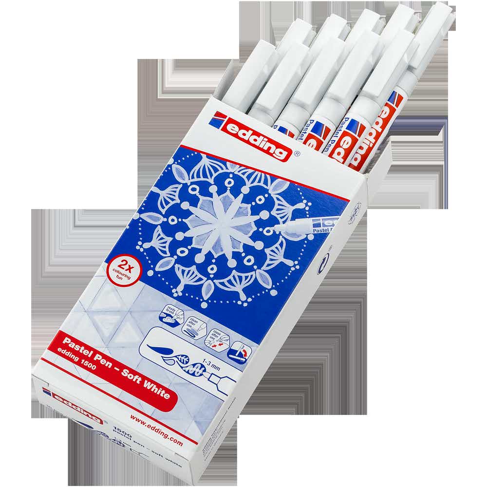 Nowy pisak pastelowy edding 1500! Dzięki pigmentowemu tuszowi na bazie wody uzyskasz efekt jasnego, półprzezroczystego wykończenia. Możesz nim namalować delikatne pastelowo-białe wzory na kolorowym, a nawet ciemnym papierze! Co więcej, możesz kontrolować stopień intensywności bieli: nanieś jedną warstwę aby uzyskać delikatny, półprzezroczysty kolor. Kiedy tusz wyschnie, ponownie pomaluj uprzednio stworzony wzór aby wzmocnić kontrast, i tym samym wzmocnić stopień krycia białego tuszu.