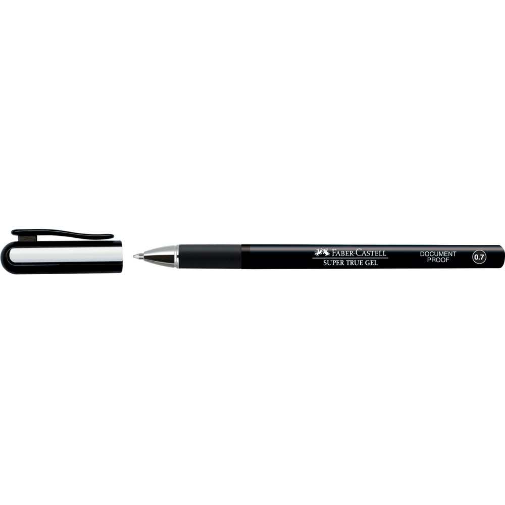 Długopis Super True Gel FABER-CASTELL z końcówką piszącą 0,7 mm. Zapewnia gładkie pisanie. Miękka strefa uchwytu. Amortyzowana końcówka dla komfortowego pisania. Nieblaknący, wodoodporny tusz. Skuwka z elastycznym klipsem. Idealny do wypełniania dokumentów. Szerokość linii pisania: F. Kolor tuszu: czarnym.