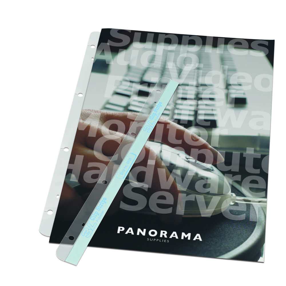 Samoprzylepne, przezroczyste listwy do mocowania dokumentów formatu A5. Umożliwiają wpięcie pojedynczych kartek oraz folderów do segregatora lub skoroszytu bez konieczności ich dziurkowania. Uniwersalna perforacja pasuje do każdego skoroszytu i segregatora, zarówno pierścieniowego jak i z mechanizmem dźwigniowym.