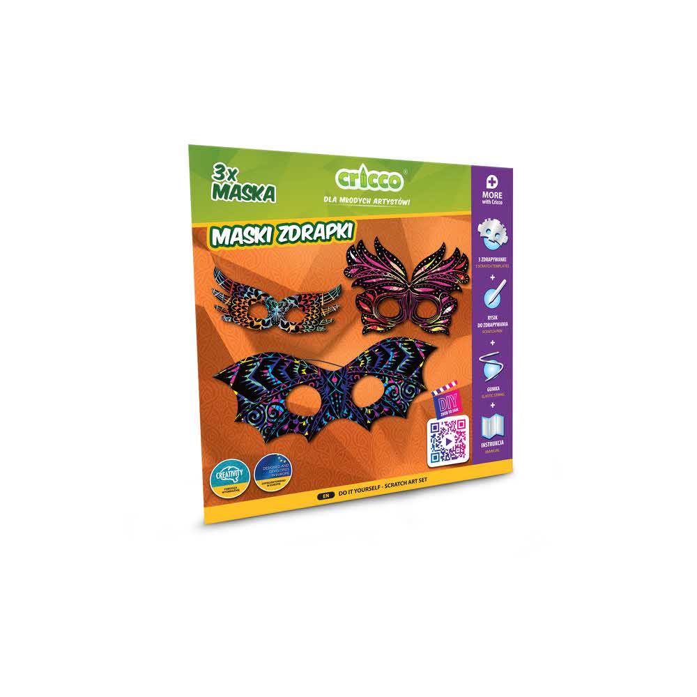 Maski zdrapki to kreatywny zestaw z serii Zrób to sam . W opakowaniu znajdziemy 3 wycięte maski w różnych kształtach z czarną wierzchnią warstwą. Za pomocą drewnianego rysika do zdrapywania, czyli patyczka, który znajduje się w zestawie, można wykonać dowolne wzory, dlatego ostateczny wygląd maski ogranicza tylko nasza kreatywność. W zestawie znajduje się również elastyczna gumka oraz ilustrowana instrukcja. Dostępne są dwa wzory masek, a także królewskie oraz książęce korony do zdrapywania. Na opakowaniu znajduje się też kod QR z odnośnikiem do bazy filmików DO IT YOURSELF z instrukcjami i inspiracjami do kreatywnych zabaw z użyciem produktów Cricco.