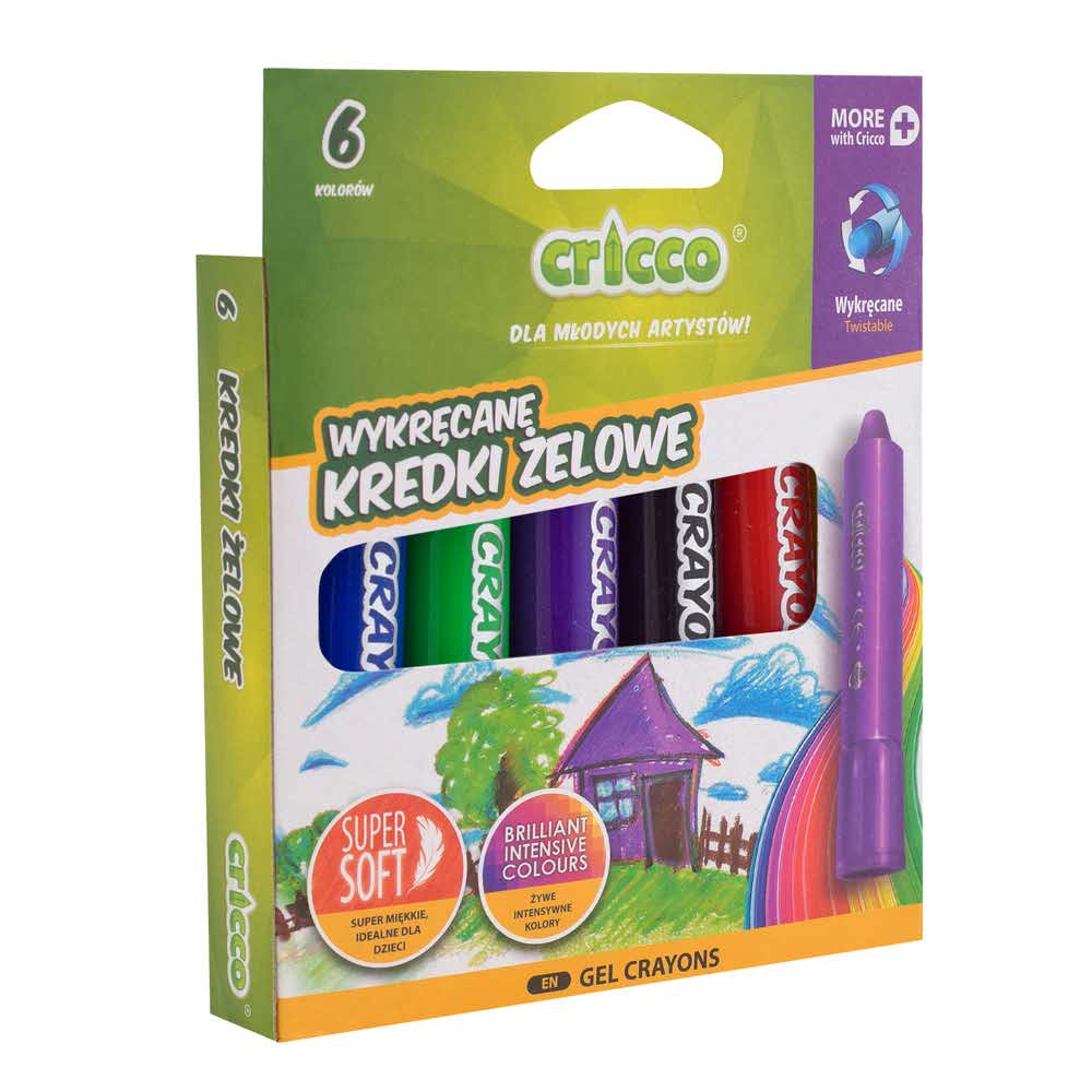 Zestaw 6 kredek żelowych Cricco w opakowaniu kartonowym z okienkiem. Kredki wykręcane typu Twist . Sprawdzają się świetnie zarówno jako standardowe kredki, mogą być używane także jak pastele czy akwarele, które można rozmywać za pomocą wilgotnego pędzelka. Bardzo miękko rysują na różnych powierzchniach.