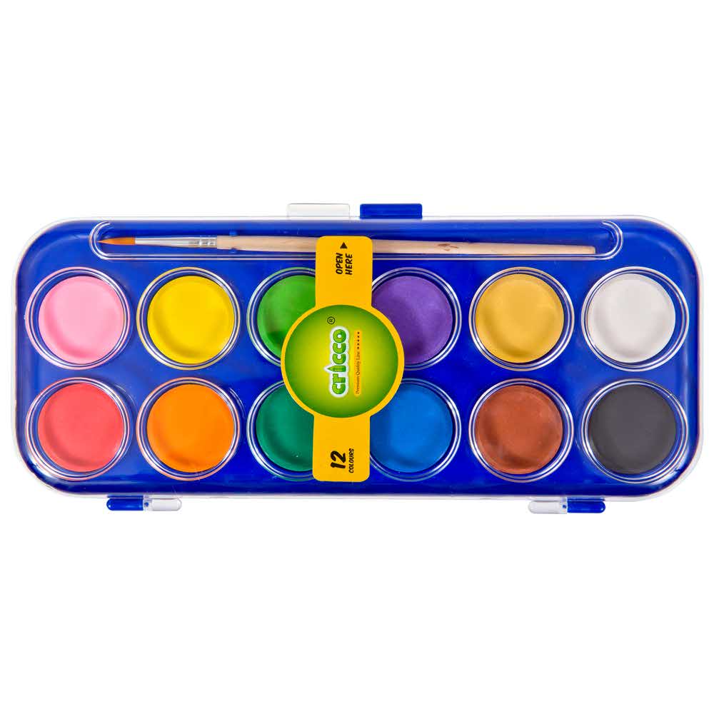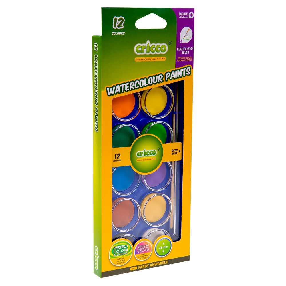 Komplet 12 farb akwarelowych w plastikowej kasetce oraz zewnętrznym kartonowym opakowaniu z zawieszką. Krążki farb mają średnicę 28mm. W zestawie dodatkowo wysokiej jakości nylonowy pędzel.