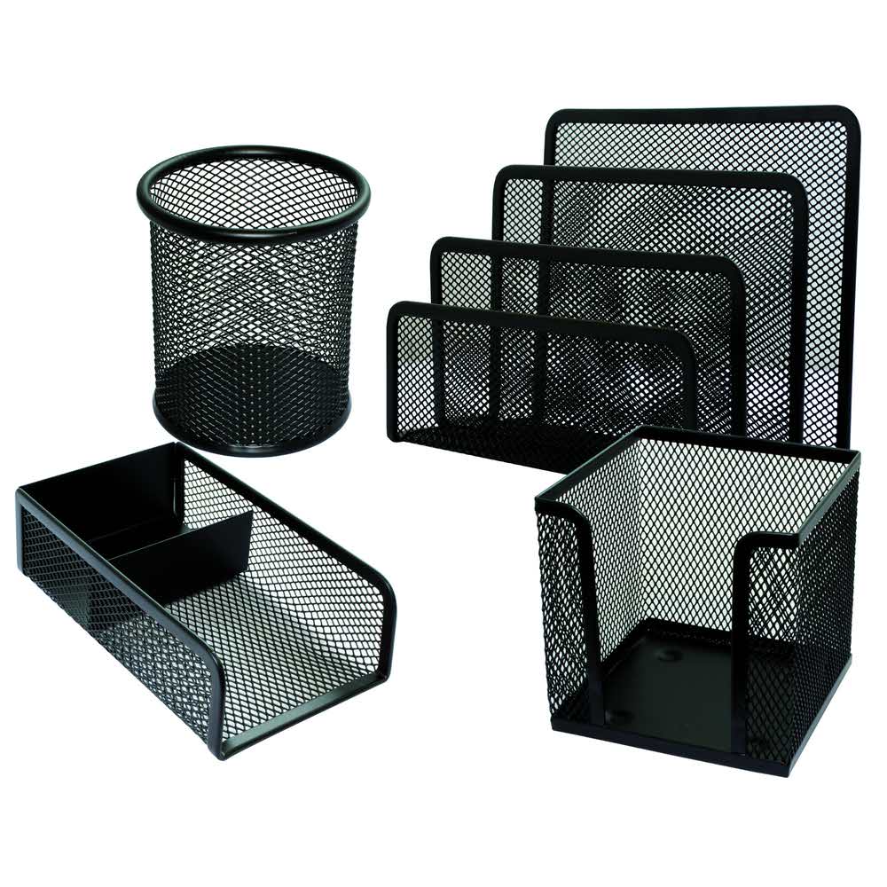 Zestaw nabiurkowy wykonany z metalowej siateczki z eleganckimi wykończeniami w tym samym kolorze, czteroelementowy: kubek na artykuły piśmienne, kubik na karteczki, podstawka na koperty, piórnik nabiurkowy na drobne akcesoria.