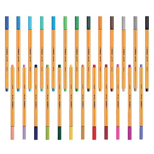 Stabilo Point 88 to najpopularniejszy w Polsce cienkopis z końcówką fibrową o grubości linii pisma 0,4 mm. Obudowa plastikowa, zatyczka w kolorze tuszu. Jedyny cienkopis dostępny aż w 25 kolorach.