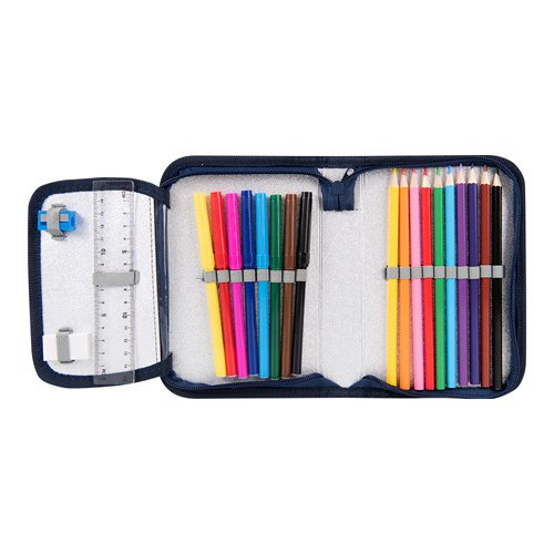 Do wyposażenia piórnika należą: kredki ołówkowe w 9 kolorach, flamastry w 8 kolorach, ołówek, linijka, temperówka oraz gumka do ścierania.