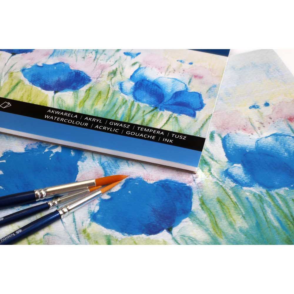 Wysokiej jakości blok do malowania farbami akwarelowymi, temperami, gwaszem oraz farbami akrylowymi, a także do ołówka, pasteli, tuszu.