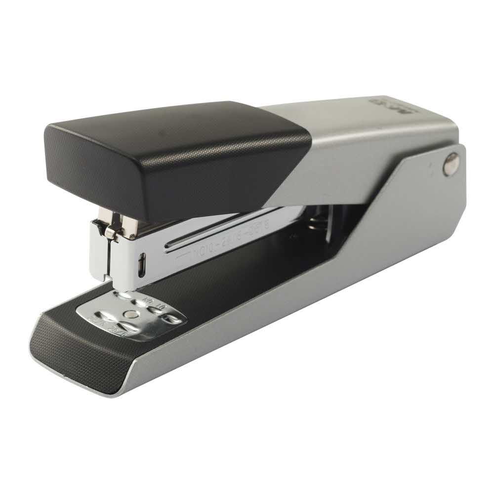 Zszywacz metalowy w kolorze złotym lub srebrnym.