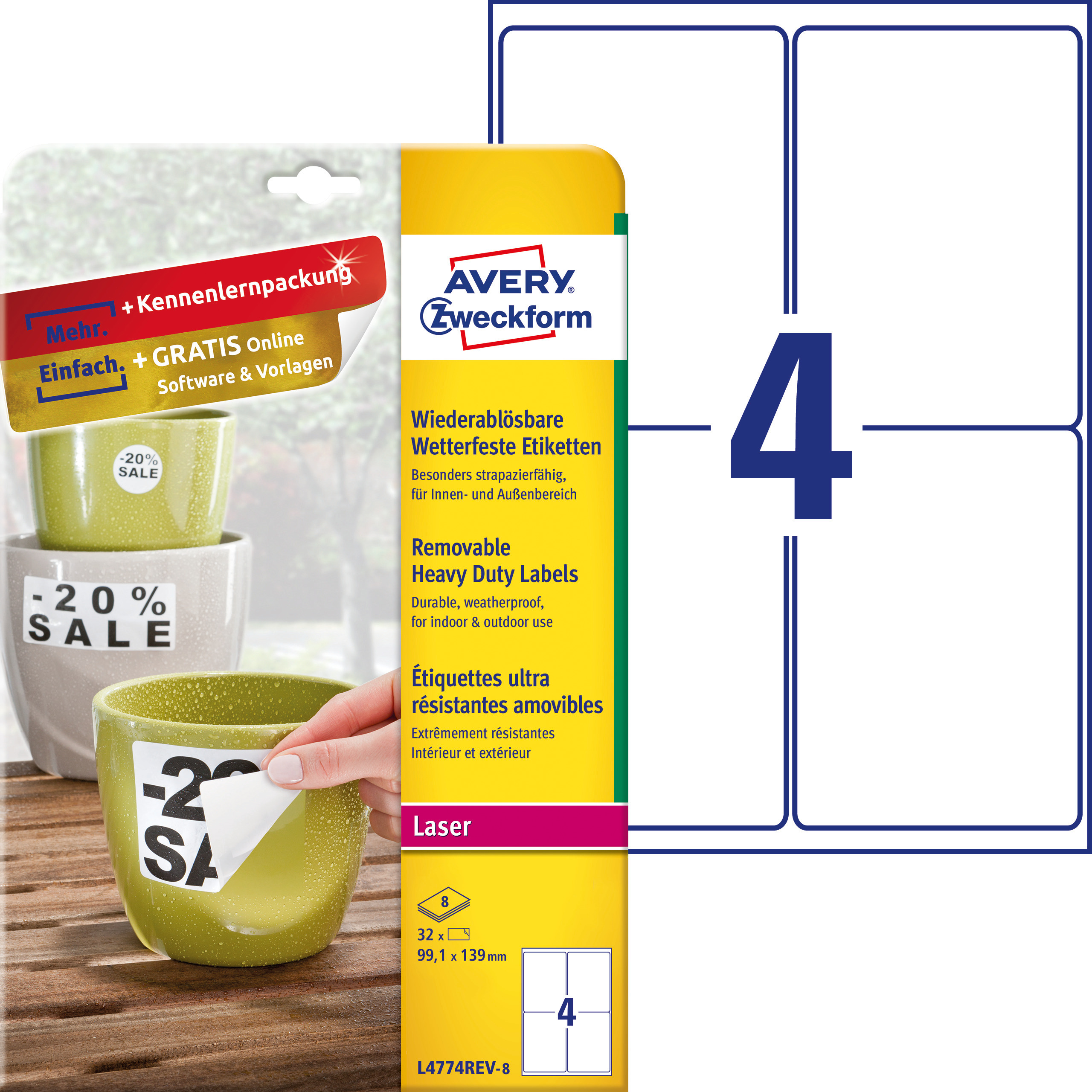 Etykiety Heavy Duty Avery Zweckform; A4, 8 ark./op., 99,1 x 139 mm, białe, poliestrowe – USUWALNE