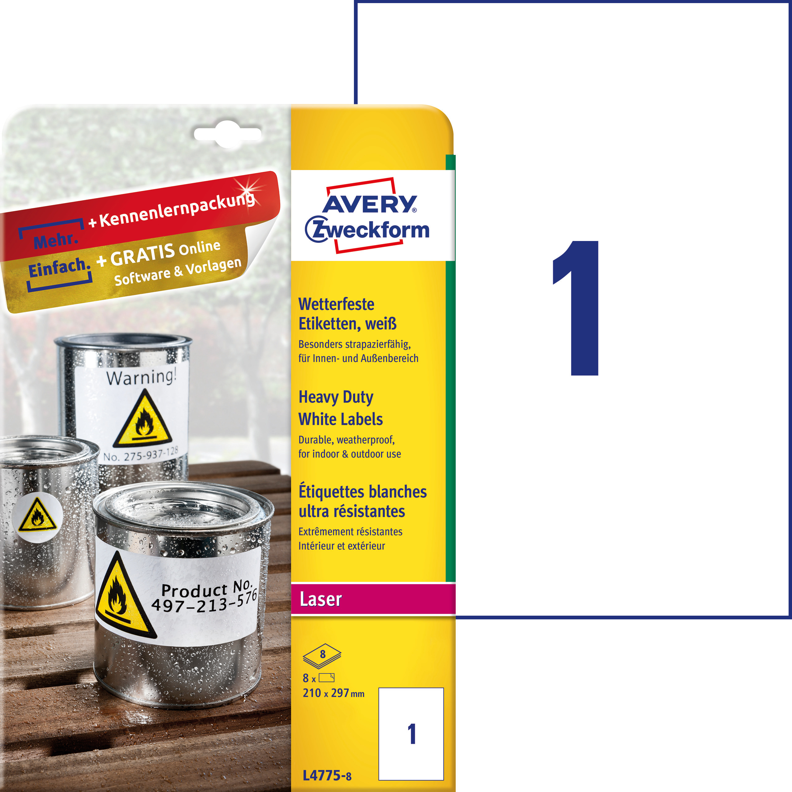 Etykiety Heavy Duty Avery Zweckform; A4, 8 ark./op., 210 x 297 mm, białe, poliestrowe