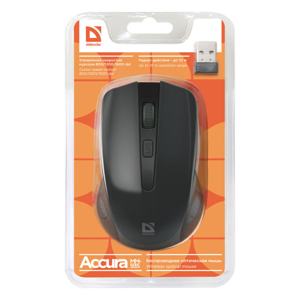 Defender Mysz Accura MM 935 1600DPI 2.4 GHz optyczna 4kl. bezprzewodowa czarna 2 szt AAA nano odbiornik zasięg 10m