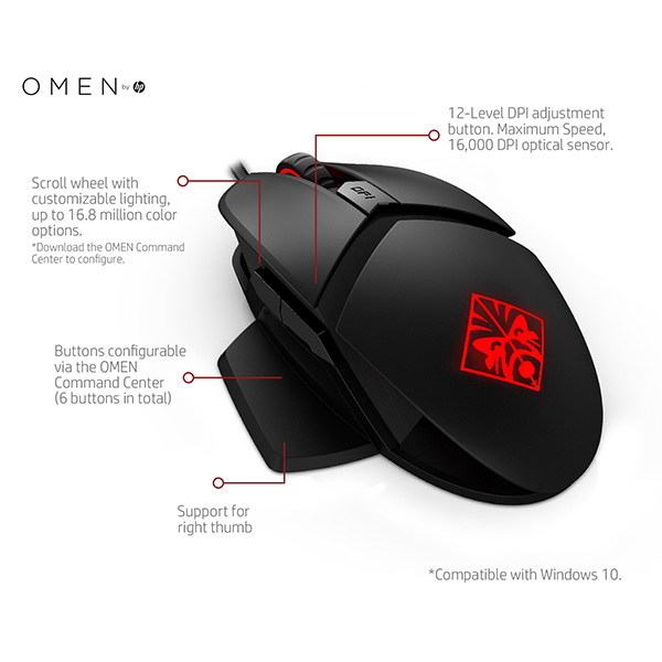 HP Mysz OMEN Reactor 16000DPI optyczna 6kl. przewodowa USB czarna 50 mln kliknięć Microsoft Windows 10