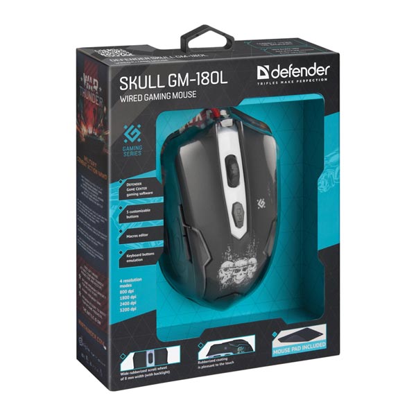 Przewodowa mysz dla graczy Skull GM-180L + podkładka*Oprogramowanie Defender Game Center*Edytor makr*Emulacja przyciskow klawiatury*4 tryby czułości myszy – Przycisk przełączenia dpi pozwala wybrać prędkość kursora (800/1800/2400/3200 dpi). Prędkość kursora wyrożniona jest kolorem oświetlenia scrolla myszy*Szeroki gumowany scroll – 8 mm (z podświetleniem)*Ultra trwały przewod*Pozłacane złącze USB*2 przyciski boczne*Ferrytowy filtr szumow*Podświetlenie*Trwała, przyjemna w dotyku powłoka gumowa*Podkładka w zestawie*5 programowanych przyciskowDane techniczne:-Komunikacja: przewodowa-Interfejs: USB-Ilość przyciskow: 5 + kołko przewijania-Rodzaj sensora: optyczny-Rozdzielczość: 800/1800/2400/3200 dpi-Maksymalne przyśpieszenie: 16 g-Kolor: czarny-Prędkość IPS: 30 IPS-Wymagania systemowe dla komputera: Windows 2000/XP/Vista/7/8/10, Mac OS X10-Długość kabla: 1.5 ±5% m-ROHS / CE: Tak