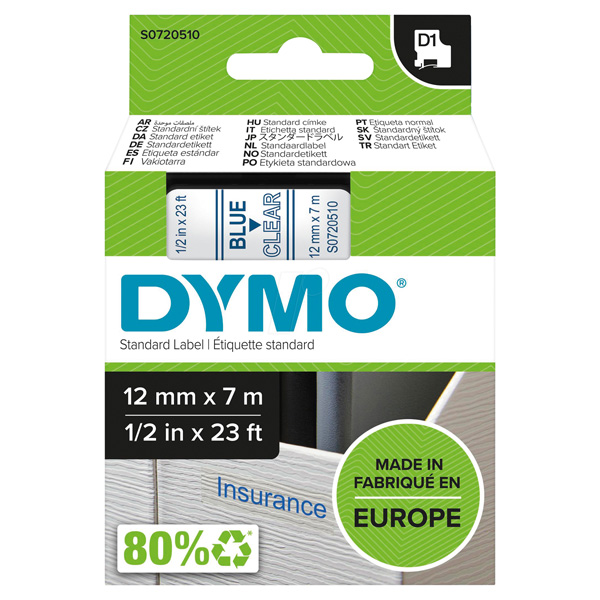 Dymo oryginalny taśma do drukarek etykiet Dymo 45011 S0720510 niebieski druk przezroczysty podkład 7m 12mm D1