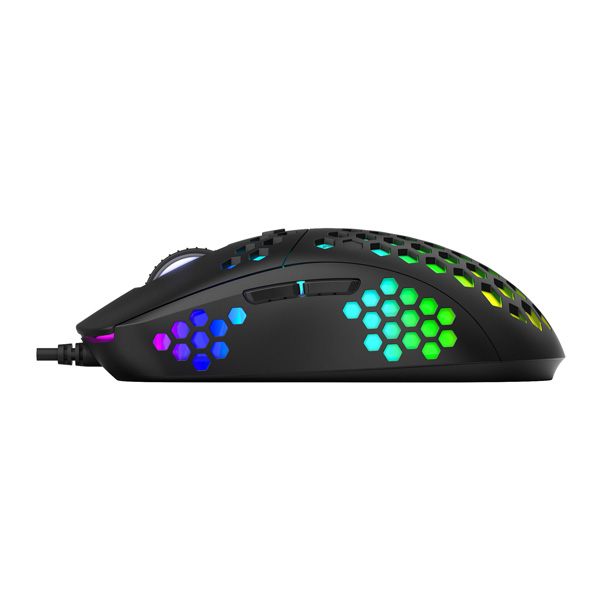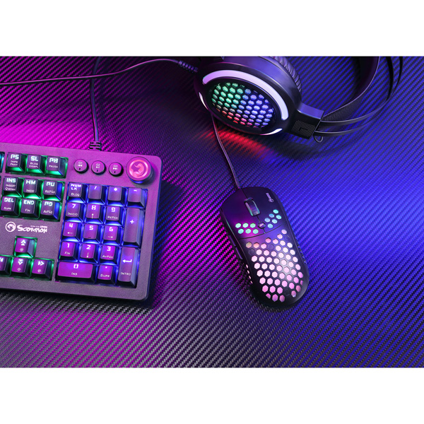 Zestaw gamingowy Marvo MH01 to rozwiązanie dla graczy, ktorzy poza najwyższą jakością cenią sobie także nieszablonowy design.Zarowno mysz jaki słuchawki wyposażone są w efektowne podświetlenie LED RGB, ktore nadaje niesamowitego charakteru.  Perforowane obudowy z wzorem plastra miodu to jedne z najpopularniejszych aktualnie wzorow w gamingu.Zestaw słuchawkowyPoza fantastycznym wyglądem, najwyższym elementem dobrego zestawu słuchawkowego są ergonomia i jakość dźwięku.Ergonomię gwarantują duże i miękkie nauszniki minimalizujące uczucie nacisku na uszy i doskonałe odcięcie od dźwiękow otoczenia. Komfortowe ułożenie na głowie zapewnia samonastawny pałąk z miękkiego tworzywa. Metalowa rama delikatnie dociska słuchawki do uszu.Za jakość słyszanego dźwięku  odpowiadają dwa wysokiej klasy 50 mm przetworniki, zamknięte w miękkie obudowie nausznikow potęgujących głębię basu.Niezbędny w drużynowej komunikacji mikrofon dookolny o wymiarach 4×1,5 mm wyraźnie przekaże każde wypowiedziane słowo.  Mikrofon zamontowany jest na giętkim wysięgniku, ktory może zostać dowolnie dostosowany do potrzeb użytkownika.Dołączony do zestawu gryzoń, mysz MH01 posiada 6 programowalnych przyciskow, ktorych funkcje można dostosowywać w dedykowanym do urządzenia oprogramowaniu.  Symetryczny kształt z niewielkim wcięciem po środku, niska waga 76g pozwalają na wygodne uchwycenie i prowadzenie myszy. Za precyzję odpowiada sensor optyczny o regulowanej skokowo rozdzielczości od 800 do 6400 DPI.Specyfikacja myszy:Czujnik: optycznyDPI: 800-1600-2400-3200-4800-6400 (domyślnie)Przyciski: 6 (programowalne)Ocena przełącznika: 3 miliony kliknięćPodświetlenie: RGBInterfejs: USB 2.0Długość kabla: 1,5 mWaga: 76gRozmiar: 125 x 64 x 40 mmObsługa systemu operacyjnego: Windows 7 lub nowszySpecyfikacja słuchawek:Pasmo przenoszenia: 20 Hz – 20 KHzRozmiar głośnika: 50 mmImpedancja głośnika: 32 ? ± 15%Czułość głośnika: 120 dB ± 3 dBTyp mikrofonu: wielokierunkowyCzułość mikrofonu: -38 dB ± 3 dBRozmiar mikrofonu: 4×1,5 mmPodświetlenie: RGBZłącza: 2x jack 3,5 mm, USB (do oświetlenia LED)Długość kabla: 2 m