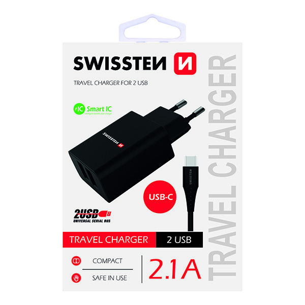 Zasilacz sieciowy adapter SWISSTEN 10W 2 portowy USB A kabel USB C Smart IC