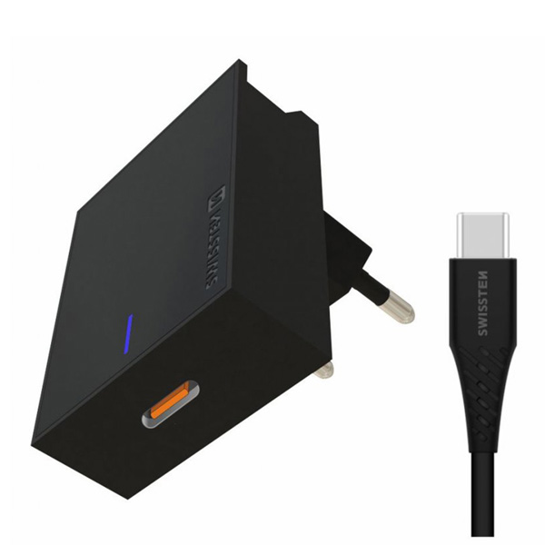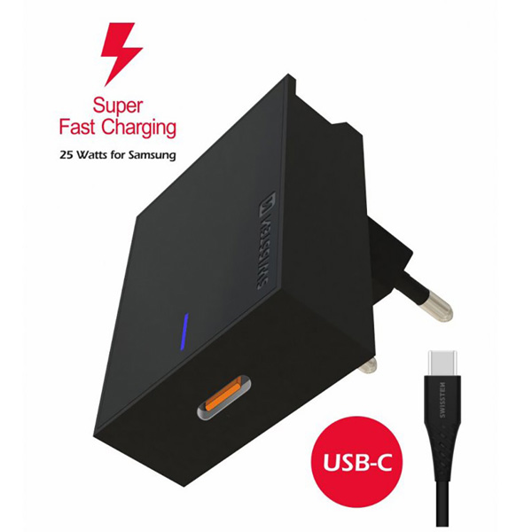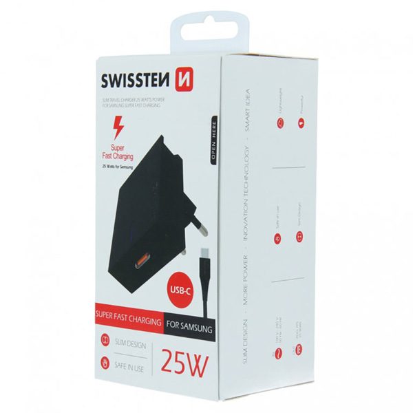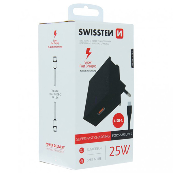 Zasilacz sieciowy adapter SWISSTEN 25W 1 port USB C kabel USB C Samsung Super fast charging stojak na telefon