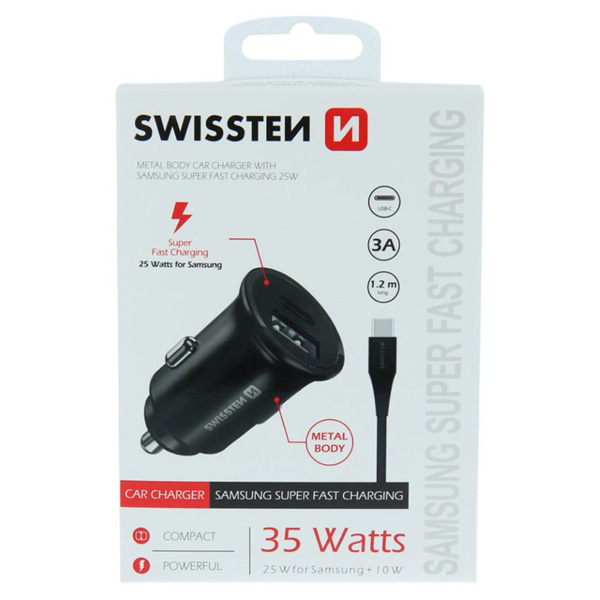 Ładowarka samochodowa SWISSTEN 35W 2 portowy USB C USB A kabel USB C Samsung Super fast charging