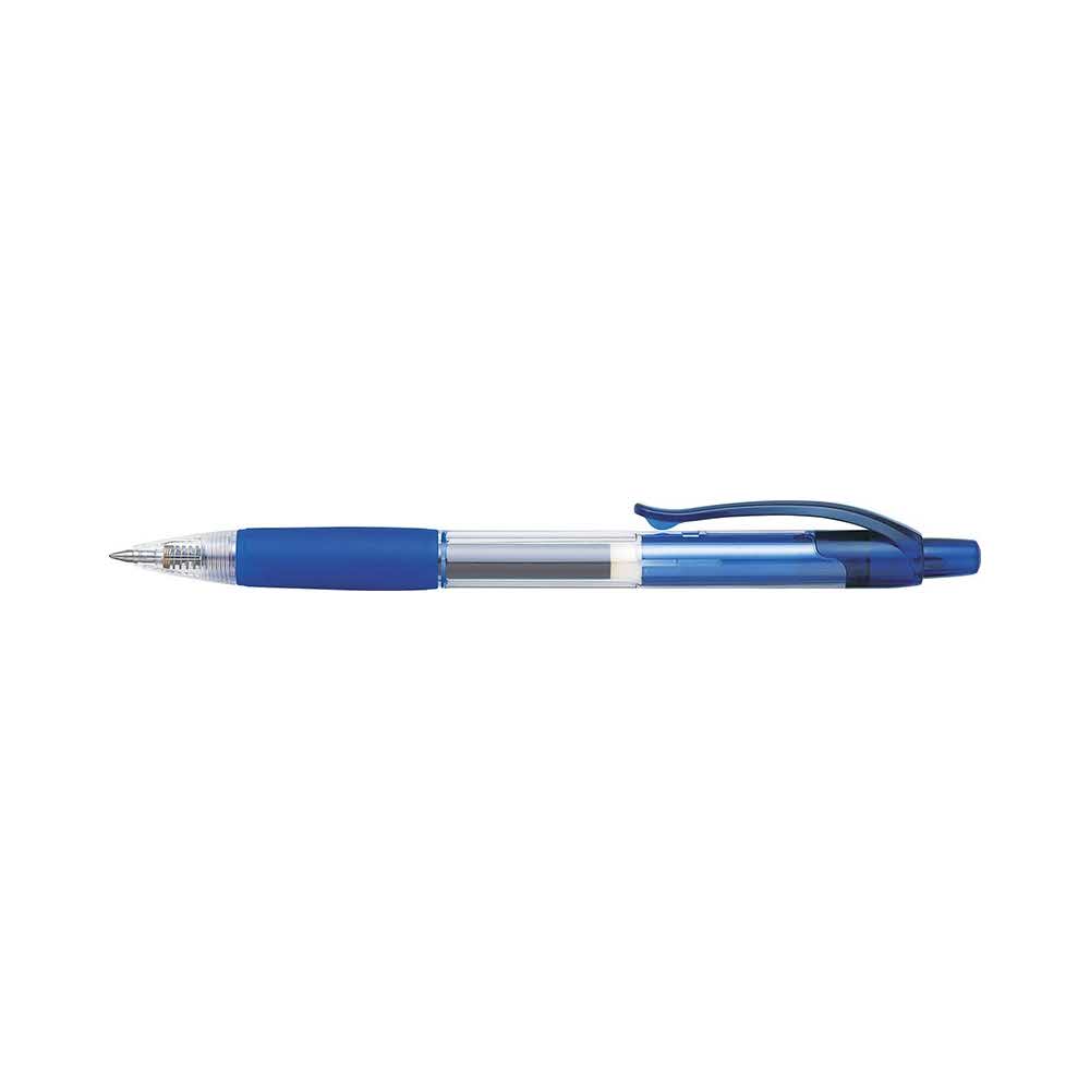 długopis automatyczny, z wymiennym wkładem gumowana rękojeść gwarantuje komfort pisania transparentna obudowa pozwala kontrolować stan tuszu rękojeść oraz profilowany klips w kolorze tuszu średnica kulki: 0,5mm grubość linii pisania: 0,25mm długość linii pisania: do 760m certyfikat ISO9001 i EN71 kolor niebieski