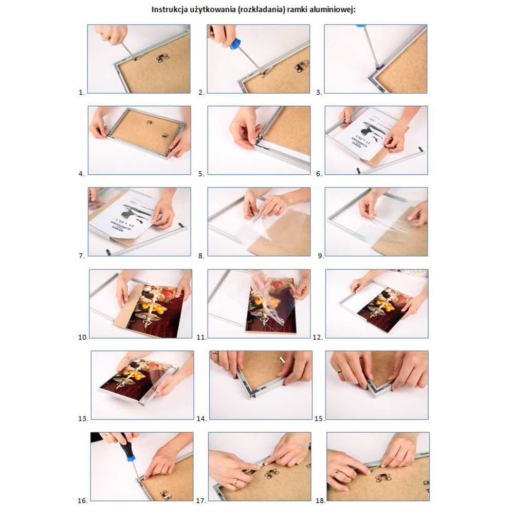 wykonana z wytrzymałego aluminium posiada przeźroczystą, plastikową szybkę tył wykonany z płyty HDF rozkręcane narożniki posiada haczyk do zawieszania rozmiar: 300x400mm