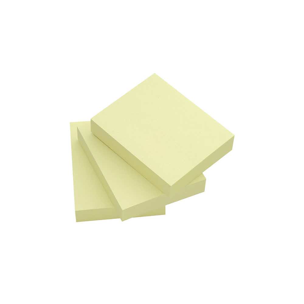 uniwersalne żółte karteczki, do zastosowania w pracy, szkole i domu ilość karteczek: 3×100 w rozmiarze 38x51mm warstwa z klejem wzdłuż dłuższego boku klej usuwalny za pomocą wody gramatura: 70gsm 3 sztuki w j.s. kolor jasnożółty