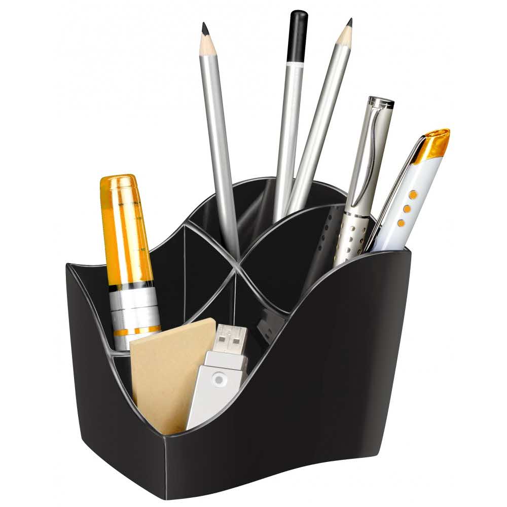 przybornik na biurko, wykonany z odpornego na pęknięcia i odkształcenia polistyrenu posiada 4 przegródki, dedykowane drobnym akcesoriom biurowym oraz artykułom piśmienniczym (mieści ok. 45 szt.) niepowtarzalny i oryginalnie zaprojektowany przybornik serii ISIS dodający ekstrawagancji w Twoim biurze futurystyczny i przyciągający wzrok design wymiary: 118x89x98mm posiada certyfikat BLAUER ANGEL kolor czarny