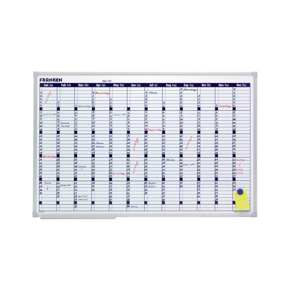 planer roczny idealny do rejestrowania spotkań i ważnych zadań prezentowany układ: styczeń-grudzień (Jan-Dec/Jan-Dez) z szerokimi polami dni rama wykonana jest z solidnego anodowanego aluminium o grubości 12mm, posiada tacę na markery zastosowanie produktu: przegląd projektów oraz ich wykonanie na przestrzeni 12 miesięcy zestaw posiada akcesoria do montażu na ścianie rozmiar tablicy: 90x60cm rozmiar siatki: pole/dzień 14x58mm 15 lat gwarancji na powierzchnię magnetyczną 2 lata gwarancji na pozostałe elementy