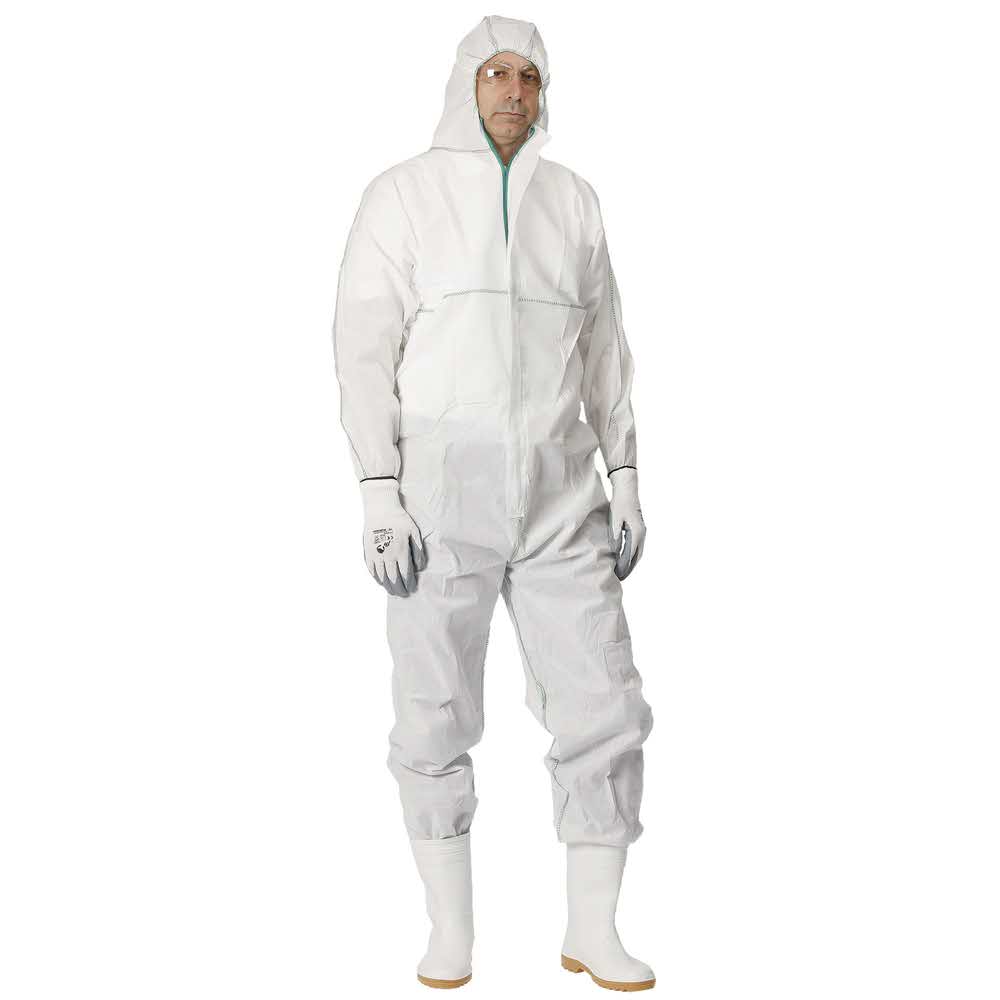 kombinezon ochronny z kapturem wykonany z włókniny polipropylenowej zamek błyskawiczny kryty patką elastyczne ściągacze z gumką w rękawach i nogawkach antystatyczny zgodnie z normą EN1149 chroni przed niektórymi związkami chemicznymi i cząstkami radioaktywnymi (zgodny z normą EN374 oraz EN1073-2) typ: 5 i 6 (zgodny z normą ENISO 1398-21 oraz EN13034) do prac: w malarstwie, w warsztatach lakierniczych, przy analizie laboratoryjnej, w przemyśle chemicznym, w rolnictwie kategoria: III rozmiar: L kolor biały