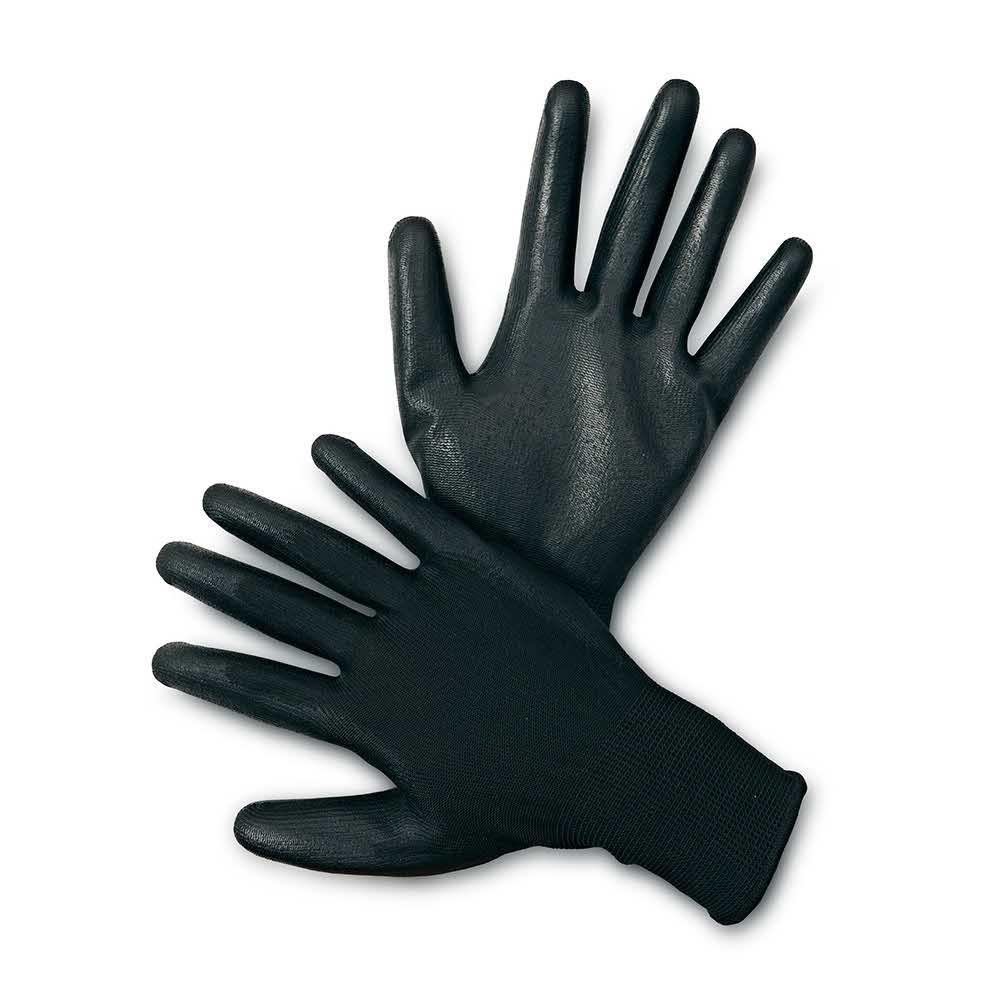 bezszwowe rękawice montażowe, zgodne z normą EN420 wyściółka poliestrowa powlekane warstwą poliuretanu w części chwytnej dłoni elastyczny ściągacz w nadgarstku najwyższa dostępna odporność na przetarcie; odporność mechaniczna zgodnie z normą EN388: 4131 do prac: w magazynach, przy pracach montażowych w branży RTV i AGD, w branży motoryzacyjnej, w branży budowlanej kategoria: II rozmiar: 9 kolor czarny