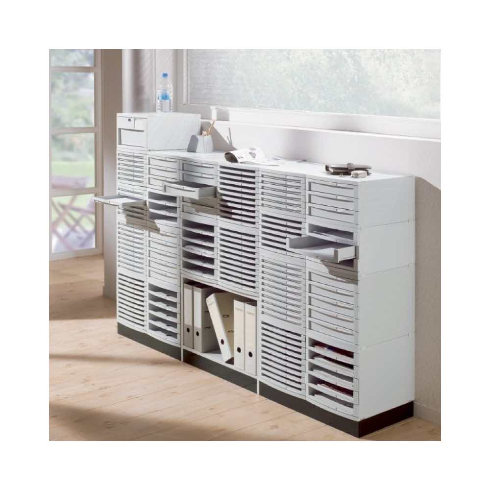 wykonany z trwałego polistyrenu posiada 10 wysuwanych, zamkniętych szuflad wygodny uchwyt ułatwia wysuwanie szufladek przeznaczony na dokumenty o wymiarach 254x355mm specjalna listwa w celu dostosowania do formatu A4 niezwykle praktyczny – opatentowany system łączenia zestawów umożliwia ustawianie stabilnych ścianek modułowych (łączniki oraz instrukcja obsługi w komplecie) każda szufladka z miejscem opisowym (etykietki w komplecie) wymiary: 300x382x307mm kolor szary